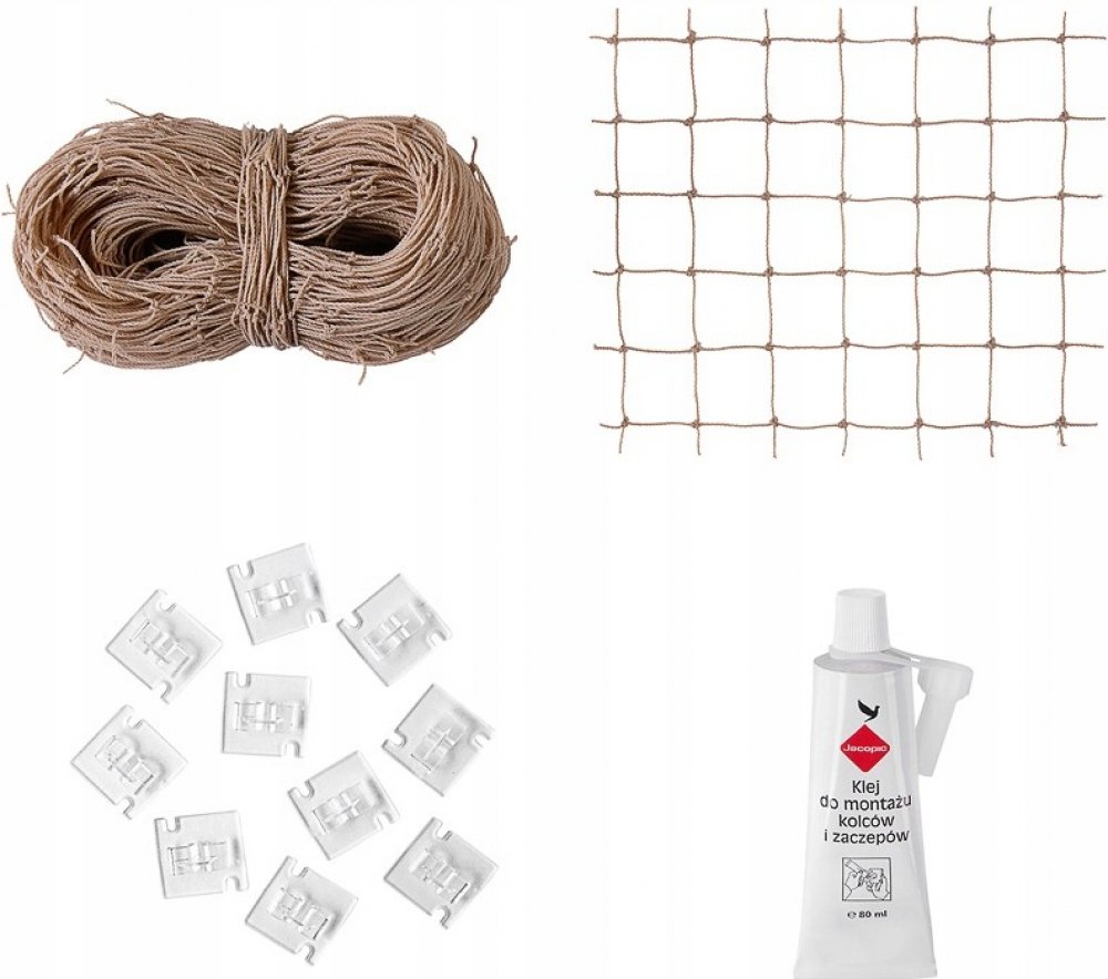 Pro montáž sítě doporučujeme speciální polykarbonátové úchytky (velmi odolné), díky kterým je montáž velmi rychlá a jednoduchá (bez vrtání, kolíků, lanek apod. ). Závěsy a lepidlo jsou k dispozici na jiné aukci.