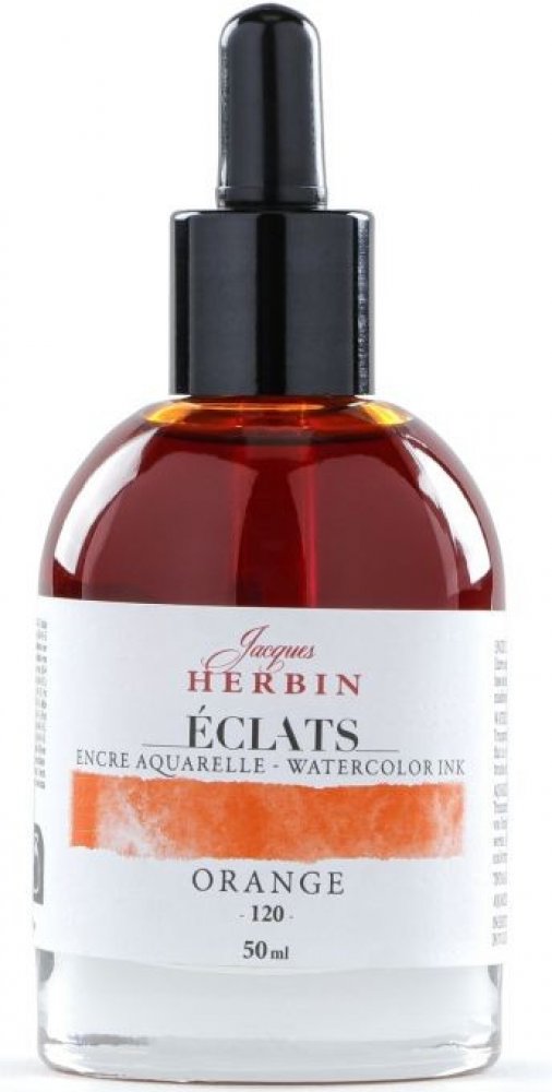 Jacques Herbin Éclats Fine Art Ink Orange 120 je zářivý, intenzivní, transparentní inkoust na bázi vody s omezenou světelnou odolností. Inkoust může být používán koncentrovaný nebo zředěný. Barvy lze vzájemně míchat a je možné vytvořit velké množství různých odstínů. Inkousty lze ředit vodou, aby se vytvořilo množství jasných tónů od nejživějších a nejintenzivnějších až po ty nejintenzivnější pastelové a průhledné. Balení obsahuje kapátko. Obsah 50ml.