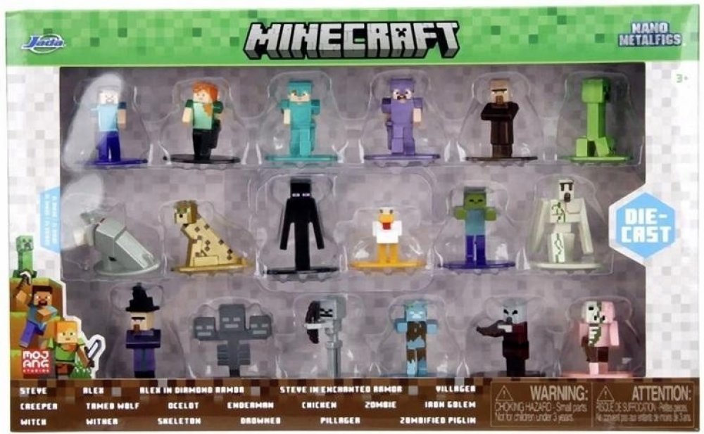 Postavičky jsou vyrobeny z pevného kovu, mají výšku přibližně 4 cm a pyšní se precizním barevným zpracováním. Sada obsahuje široký výběr hrdinů, mobů i zvířa...