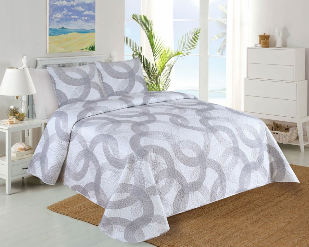 Přehoz na postel se vzorem propletených kruhů v šedých barvách. Přehoz je k dispozici na jednolůžko v rozměru 140 x 220 cm a je dodáván s povlakem na polštář 45 x 45cm v hladkém provedení ze 100% polyesteru s prolisovaným vzorem jakoby proševu.