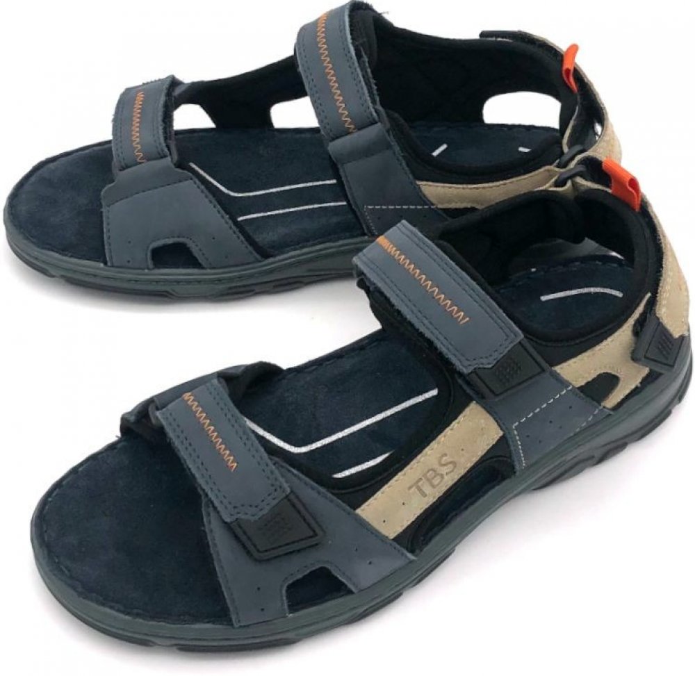 Pánské sandály, vyrobené z nubukové kůže. Vnitřek obuvi tvoří textilní podšívka a komfortní kožená stélka. Obuv je vybavena technologií TBS Ortholite® - obsahuje speciální pěnu, díky které jsou sandály lehké, prodyšné a skvěle absorbují nárazy při chůzi. Snadné nazouvání zajišťují pásky na suchý zip.
