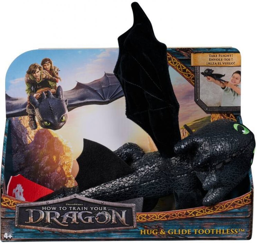 Vzlétněte do nebe s Bezzubcem! Tato inovativní plyšová hračka zobrazuje ikonického draka z filmu Jak vycvičit draka s detaily přesně jako z filmu, včetně měkkého černého plyše s lesklými šupinami, plstěnými drápy a jasně zelenýma vyšívanýma očima. Bezzubec je připraven na let s velkými, sametově měkkými křídly, která dosahují délky 40 cm, díky čemuž se může klouzat a přenést vás na ostrov Berk! Jednoduše mu uchopte dva prsty pod přední drápy, potáhněte je dozadu a pusťte, aby se Bezzubec vznášel vzduchem! Jeho měkká křídla se pak s cvaknutím stočí dovnitř a příjemně vás obejmou, když je čas na mazlení. Ať už jde o narozeniny, svátek nebo jakoukoli oslavu, tento roztomilý plyšový drak je působivým dárkem pro fanoušky filmu Jak vycvičit draka a každého, kdo má rád rodinné filmy.