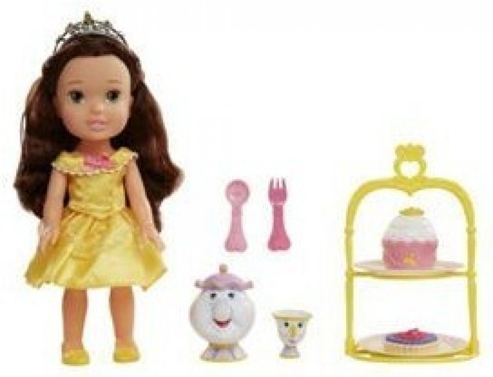 Disney panenka princezna Bella 30cm + čajový dýchánek. Kouzelná panenka Bella z animované pohádky Kráska a zvíře tentokrát na čajovém dýchánku. Společnost jí dělají kamarádi konvička a hrneček a další příslušenství. Panenka je vysoká 30cm. Originál s licencí Disney.