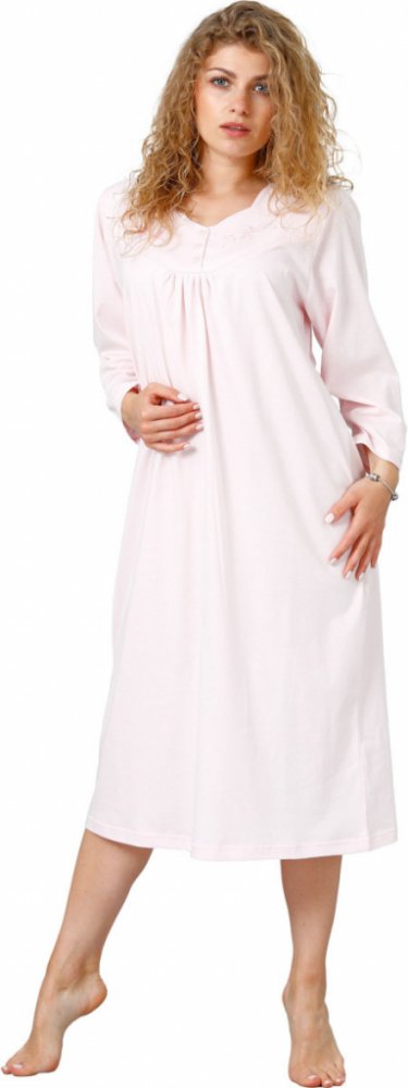 Vyrobená ze 100 % bavlny, je jemná, prodyšná a vhodná i pro citlivou pokožku. Bavlna zaručuje přirozený pocit sucha a svěžesti po celou noc. Má splývavý střih se záhyby v oblasti hrudníku. Délka po lýtka je ideální pro ženy, které preferují komfort a decentnost v jednom. Jemný výstřih do V se zdobením a zapínáním na knoflíky působí něžně a elegantně. Dlouhé rukávy oceníte hlavně v chladnějších večerech.