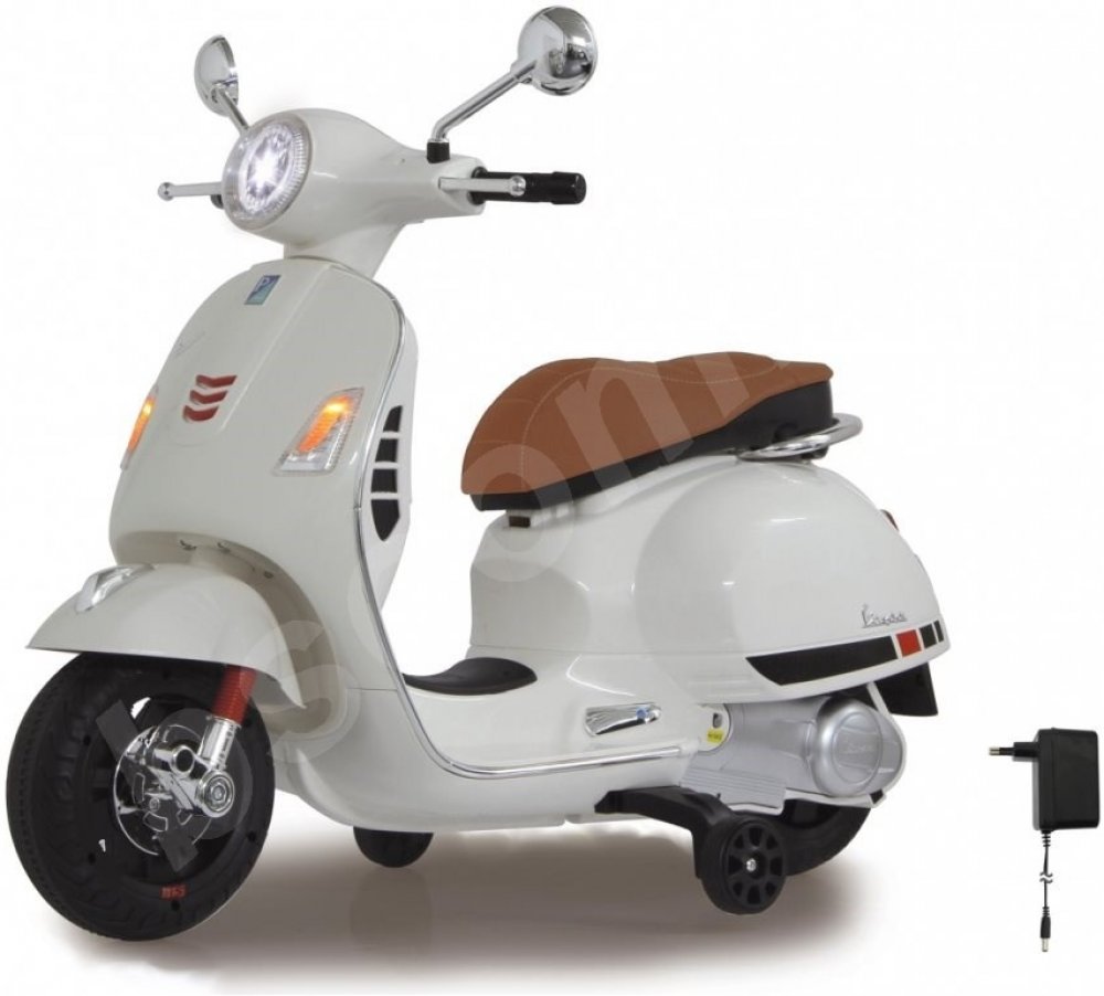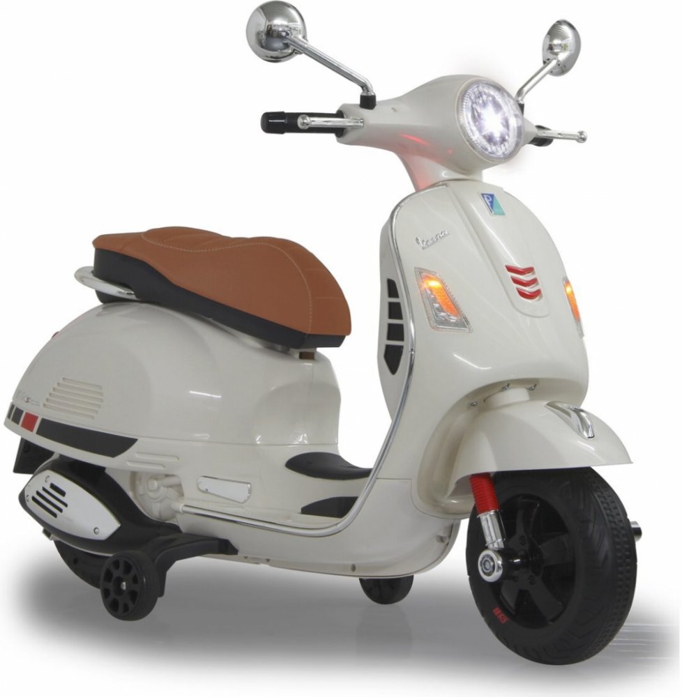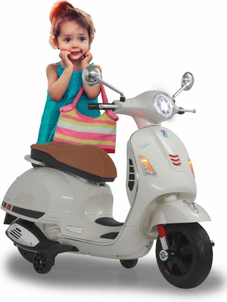 Říditelná motorka Ride-on Vespa 12V, pro děti od 3 let, dlouhá výdrž baterie, světla, USB, AUX, dva motory, blinkry, plynový pedál, podpůrná kolečka, kožená sedačka, funkce dopředu/dozadu/doleva/doprava. Rozměry: 1020x505x755mm, Hmotnost: 9,82Kg.