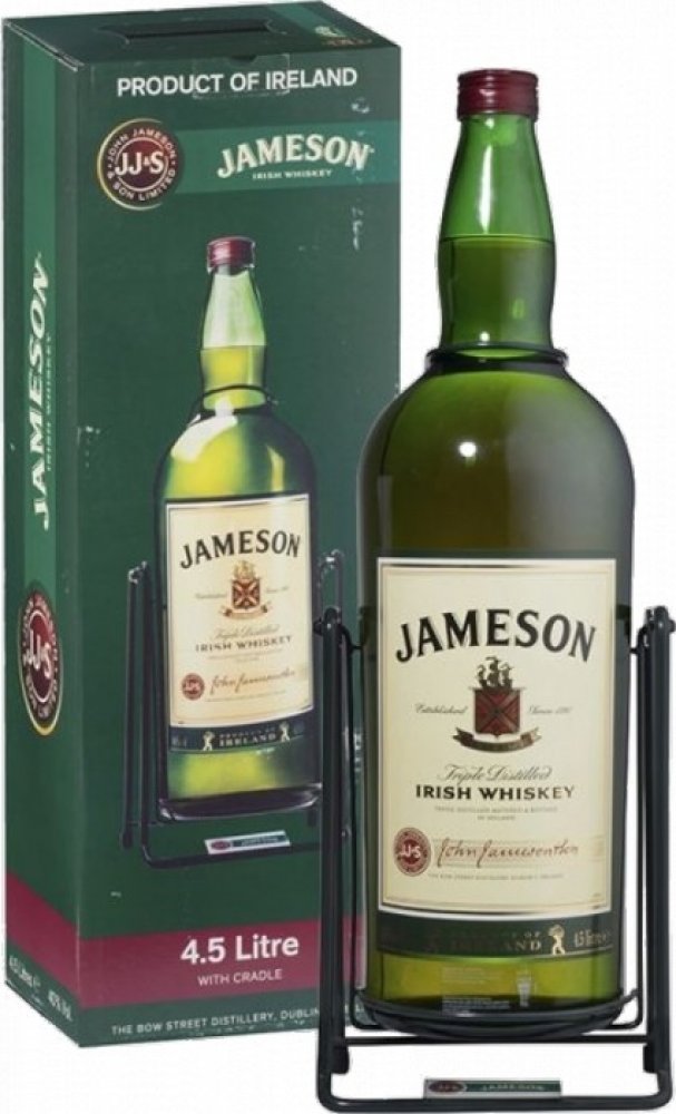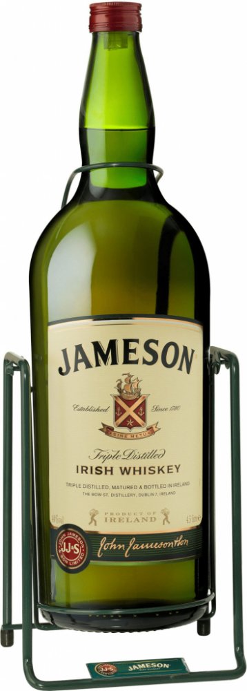 Obrovská 4,5-litrová láhev klasické irské směsi Jameson. Před zráním se třikrát destiluje z irského ječmene a čisté pramenité vody. Je to také nejprodávanější irská whisky na světě a ne bezdůvodně...