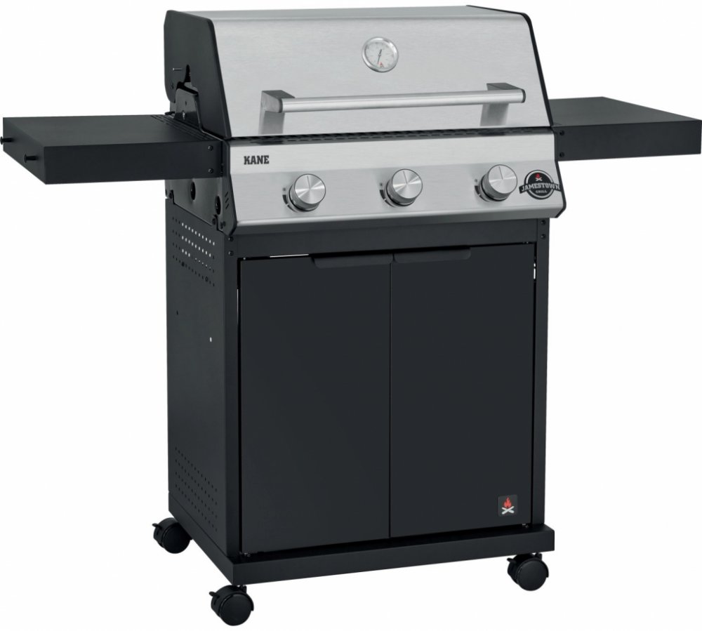 Plynový gril JAMESTOWN KANE Tento plynový gril JAMESTOWN KANE je všestranným pomocníkem při grilování. Je vhodný pro přímé grilování potravin na roštu přímo nad hořáky s vysokými teplotami, i pro nepřímé grilování potravin, které se připravují šetrněji nikoliv přímo nad hořáky, nýbrž po stranách na grilovacím roštu vedle hořáků s nejnižšími teplotami, grilované potraviny se tak nepřipalují a zůstávají šťavnaté. Grilovat můžete až 7 steaků současně. Odkládací nerezový rošt zajistí, že pokrmy zůstanou teplé, zatímco připravujete další pochoutky. Bohatá výbava Gril JAMESTOWN KANE disponuje 3 plynovými, samostatně nastavitelnými hořáky z nerezové oceli s celkovým výkonem 9 kW, litinovým grilovacím roštem o rozměru (š x h) 61 x 41,5 cm a nerezovým ohřívacím roštem. Víko grilu z oceli s práškovým nástřikem a z nerezové oceli o tloušťce 8 mm s pohodlným madlem disponuje integrovaným teploměrem. Odolný teploměr vám umožní snadno sledovat teplotu uvnitř vašeho grilu. Teplota až 360 °C vám zaručí všestranné možnosti přípravy. Pro rychlé, snadné a spolehlivé zapálení hořáků je gril vybaven piezo zapalováním. Grill je vhodný pro použití v zemích CZ, SK, SI a BH. Pro provoz je nutná propan butanová láhev (LPG) min. 5 kg/ max. 11 kg o maximální velikosti (v x pr.) 600 x 300 mm. K propojení propan butanové láhve ke grilu slouží hadice s regulátorem tlaku o maximální délce 1500 mm. Přípojný tlak maximálně 37 mbar. Láhev se ukládá do uzavíratelné police pod gril. Dostatek úložného prostoru Gril JAMESTOWN KANE o rozměru (v x š x h) 107,3 x 129,4 x 53 cm je vybaven dvěma postranními odkládacími stolky, pro všechny vaše nezbytnosti, které při grilování potřebujete. Postranní stolky jsou skládací, a tak je můžete sklopit, když je zrovna nebudete potřebovat. Z tohoto důvodu je gril kompaktní na skladování, a díky 4 kolům i snadný na přesouvání. Praktickým doplňkem jsou háčky na postranních stocích k zavěšení grilovacího náčiní.