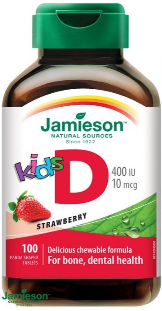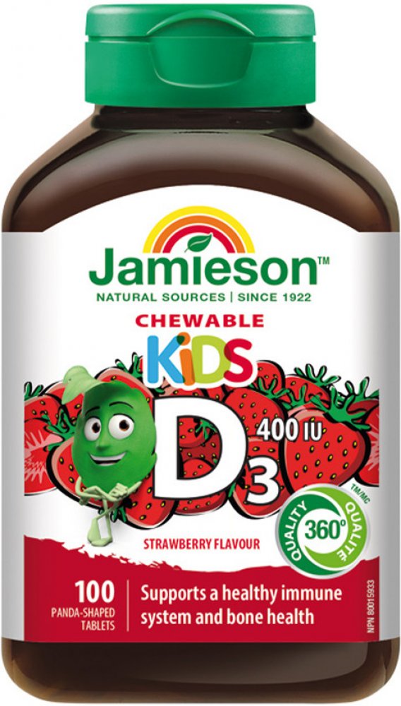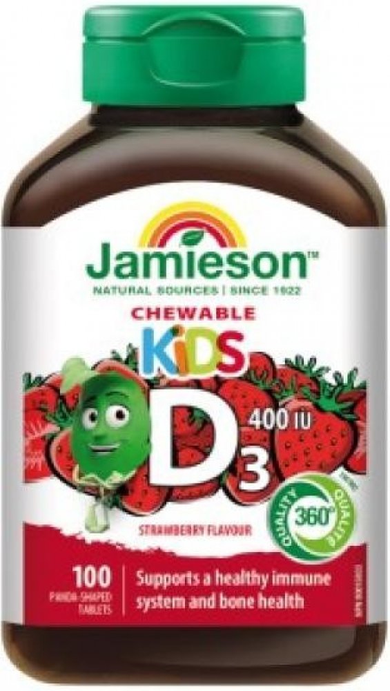 Doplněk stravy Jamieson s vitamínem D3 400 I.U. pro Vaše děti Komfortní užívání cucavých tablet ve tvaru medvídka pandy s lahodnou jahodovou příchutí.