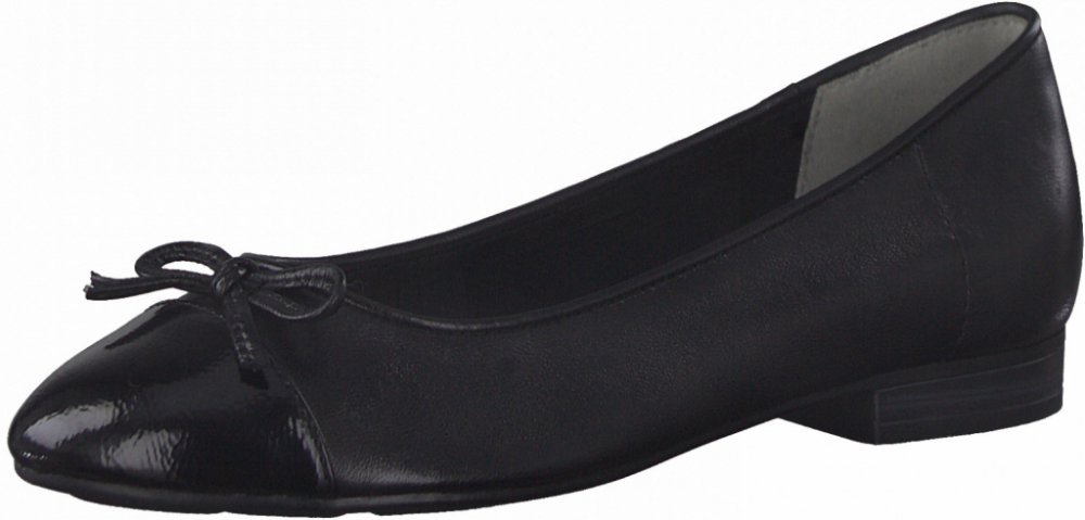 Dámské balerinky značky Jana. Kožený hladký svršek je doplněn jemně lesklou špičkou a mašličkou. Stélka je příjemně vyměkčená a potažena kůží..