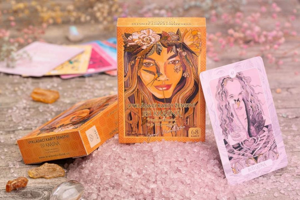 Vykládací karty ženství „ JSI KRÁSNÁ“ Vám mohou ukázat cestu, jak se v sobě lépe vyznat. Pochopit, co je ženskost a co je vnitřní ženství. Ručně ilustrované karty odhalují 68 témat, kterými se dotknete svého skrytého vnitřního života. Karty Vám prozradí vše, co se Vás hluboce dotýká, co s Vámi rezonuje, jaké pocity a emoce jednotlivá témata ve Vás probouzejí. Můžete tak odhalit svou pravou tvář, svou nejhlubší podstatu. Na každé zadní straně karty je její význam vyjádřen básní i vzkazem. Téma pro tu danou chvíli odhaluje Vaše možnosti a ukazuje Vám, jakým směrem se můžete vydat. Poselstvím vykládacích karet ženství „ JSI KRÁSNÁ“ je podpora každé z Vás, abyste věřila a zůstala věrná sama sobě. Zasloužíte si to! Čím dříve budete spojena sama se sebou, tím dříve bude Váš život naplněný láskou, něhou, lehkostí, radostí, kvalitními vztahy, zdravím, sebedůvěrou a štěstím.