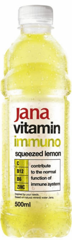 Jana Vitamin Water citron 500 ml Přírodní neperlivá minerální voda Jana vitamin citron s vysokým obsahem vitamínů C, B6 a B12, zdroj minerální látky - zinku. Vitamíny C, B6, B12 a zinek přispívají ke správnému fungování imunitního systému. Jana přírodní neperlivá voda získala zlatou medaili na mezinárodní soutěži Monde Selection v 6/2019. Byla vybrána z 2984 výrobků z 90 zemí, 70 odborníky a specialisty z oboru. Lékaři, odborníci na zdravou výživu, profesoři a také kuchaři z restaurací které získali Michelinskou hvězdu. Vyniká svojí jemností a čistou chutí přírody z hloubky přes 800 m. Ne všechny vody jsou stvořeny stejně. Díky jedinečné hloubce zdroje a minerálnímu složení vrstev půdy, kterými prochází, má voda Jana čistotu, nezaměnitelnou minerální kompozici a rozpoznatelnou, hedvábnou chuť. Každá lahev Jany má dokonalý poměr vápníku a hořčíku a hodnotu pH 7,1, která pomáhá udržovat vitalitu a přirozenou rovnováhu vašeho těla. Složení: voda, cukr, fruktozový sirup, koncentrovaná citrónová šťava (1,5 %), kyselina citrónová, přírodní citrónové aroma, přírodní citrusová aroma, regulátor kyselosti: E331, stabilizátor: E414, E445, zinek, sladidlo: glykozid steviolu, Vitamíny: C, B6 a B12 Přírodní neperlivá minerální voda Jana vitamin citron s vysokým obsahem vitamínů C, B6 a B12, zdroj minerální látky - zinku. Vitamíny C, B6, B12 a zinek přispívají ke správnému fungování imunitního systému