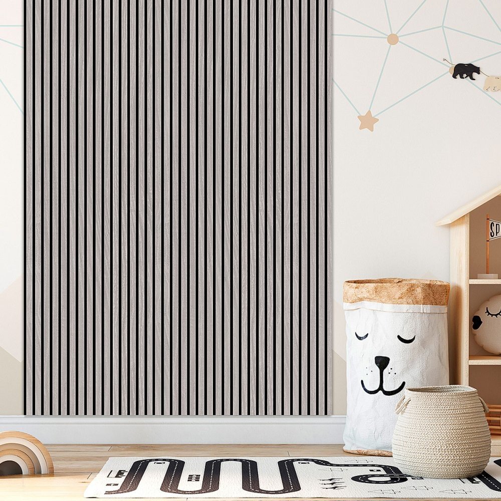 Akustické dřevěné lamelové panely na stěny a strop Jangal vám zajistí nejen atraktivní vzhled, ale také zlepší akustiku v místnosti. Šedivý odstín dubu působí nadčasově a skvěle se hodí ke kombinaci s tmavšími a výraznějšími barvami. Tento akustický panel vám pomůže snížit hluk a dotvořit tak příjemný pocit v místnosti.