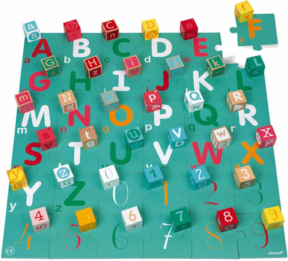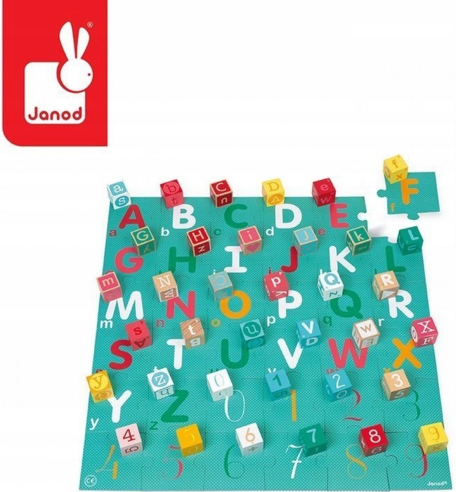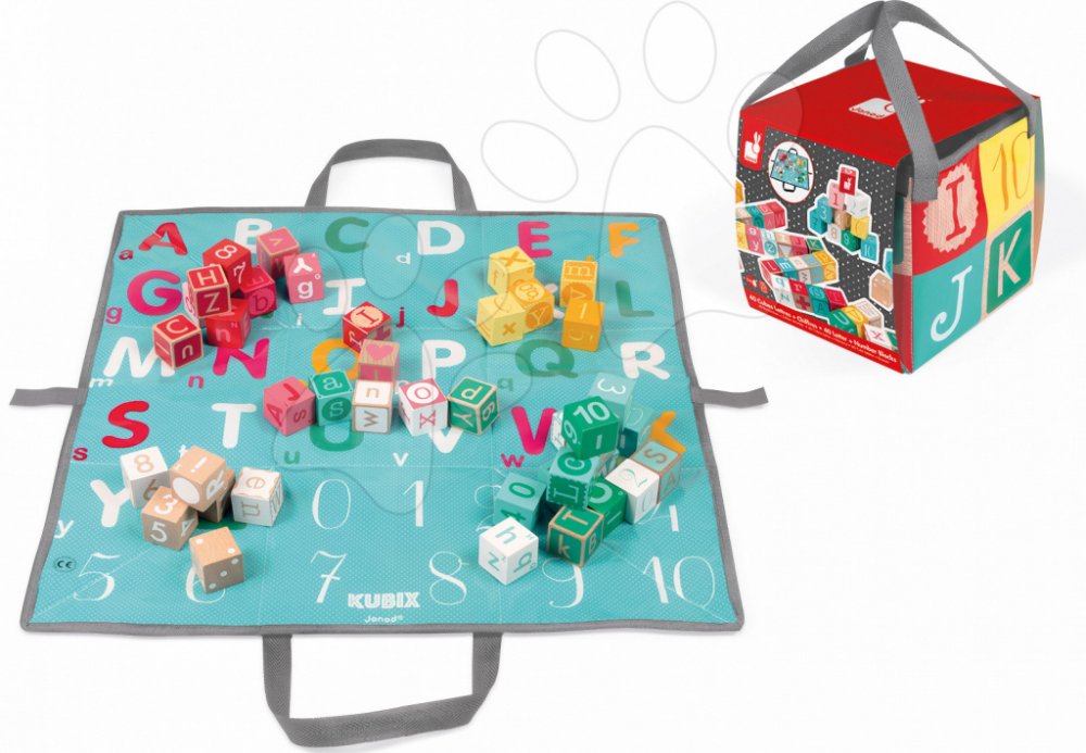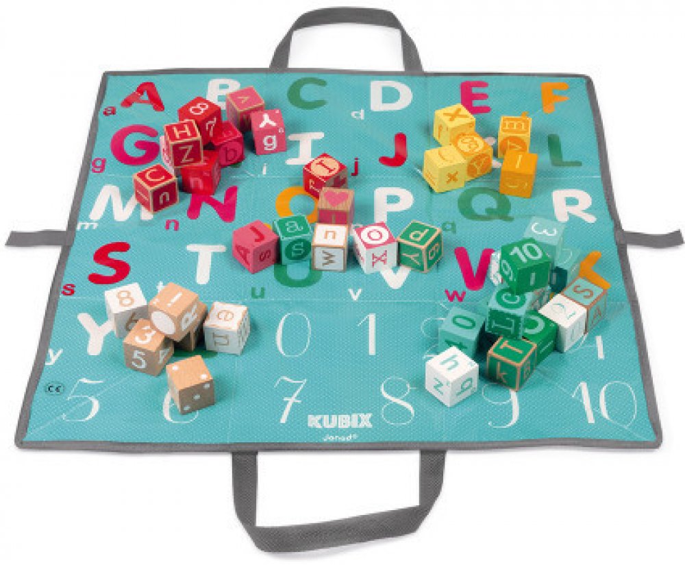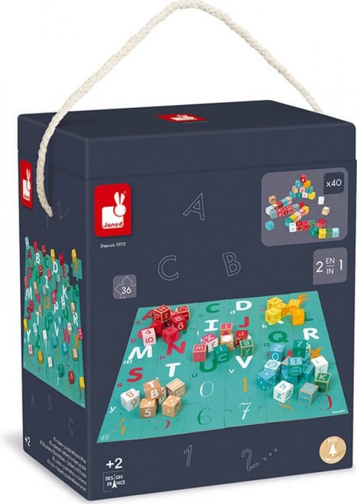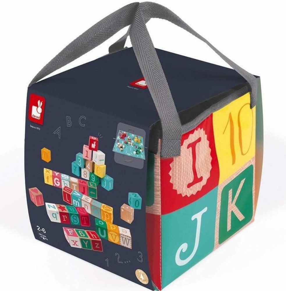 Janod sada 40 kostiček z masívního dřeva, natřené barvou na vodní bázi. Na kostičkách jsou čísla a písmena abecedy, děti si tak mohou trénovat psaní a počítání. V praktickém obalu, kam lze kostičky umisťovat, nebo je v něm přenášet.