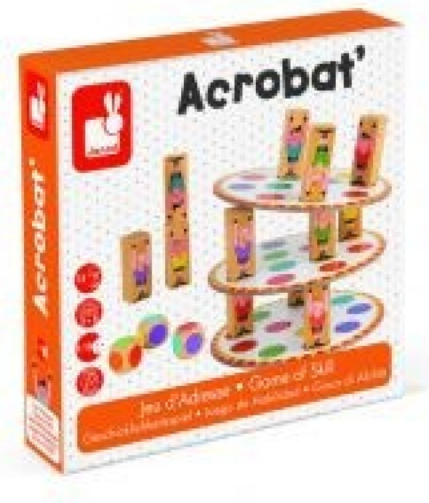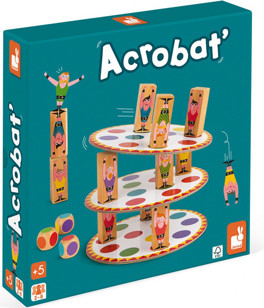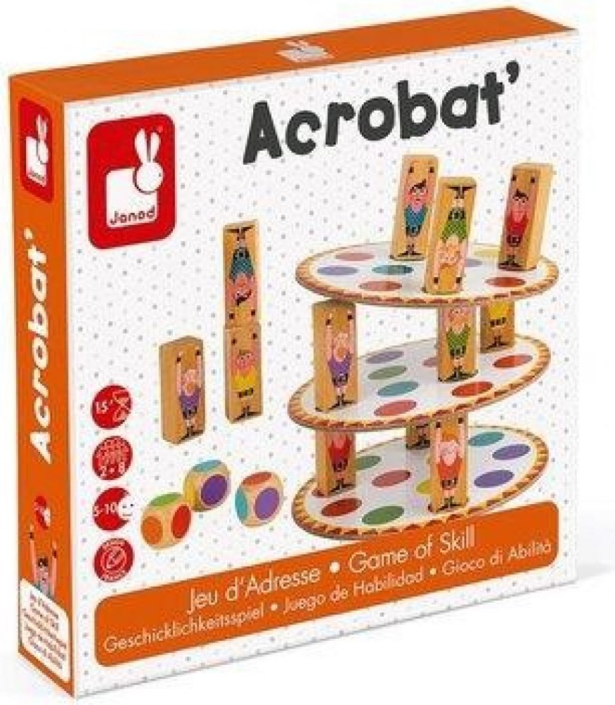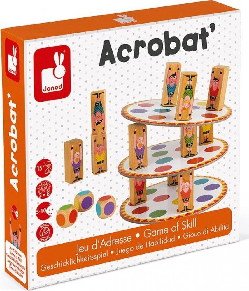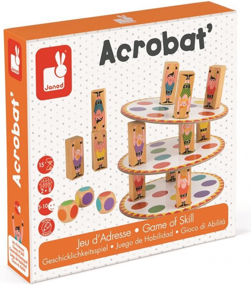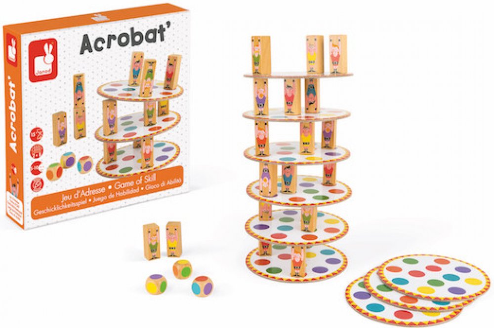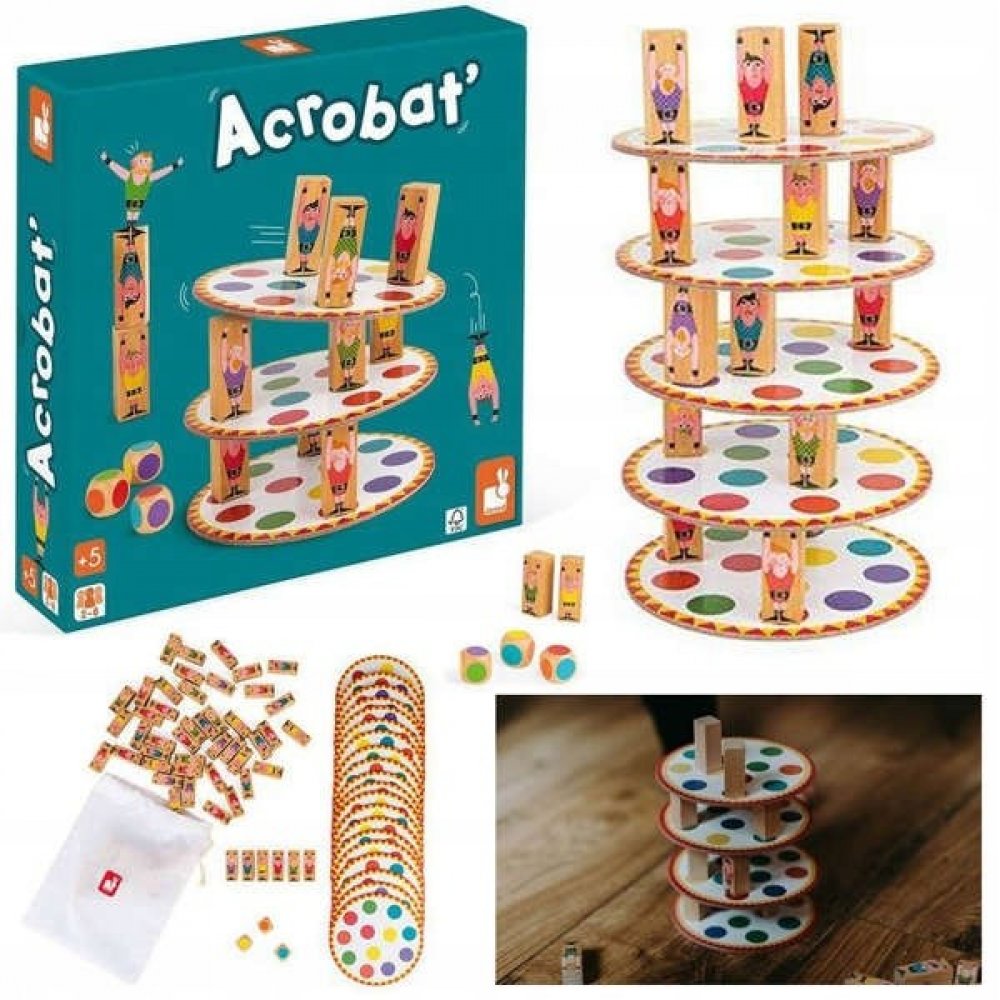 Dětská společenská hra Akrobati od firmy Janod je zábavná balanční hra pro děti. Musíte v ní postavit co nejvyšší věž plnou akrobatů. Není to však snadné. Každý akrobat má své místo.