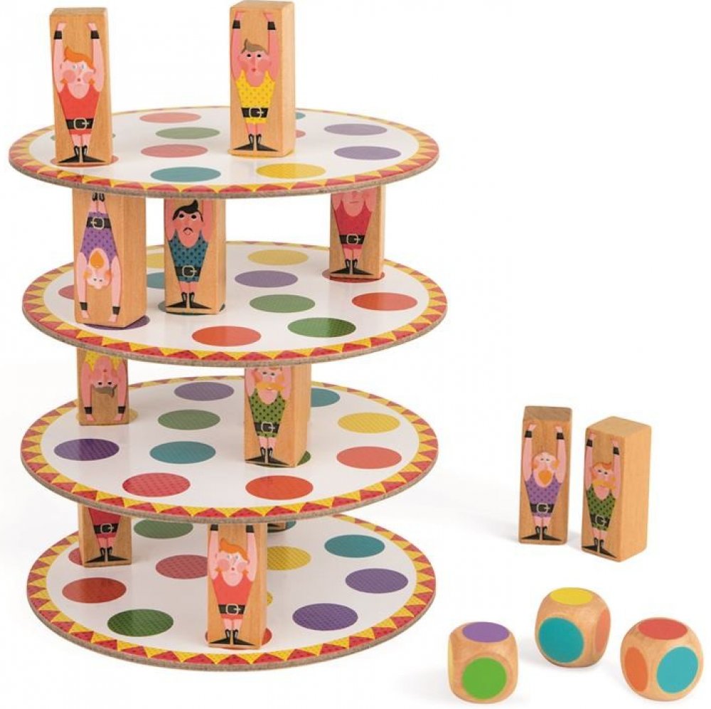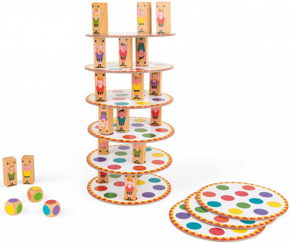 Ve hře děti najdou základny s barevnými políčky pro akrobaty, dřevěné kostky s barvami a sadu akrobatů, pomocí kterých postaví velkou věž.
