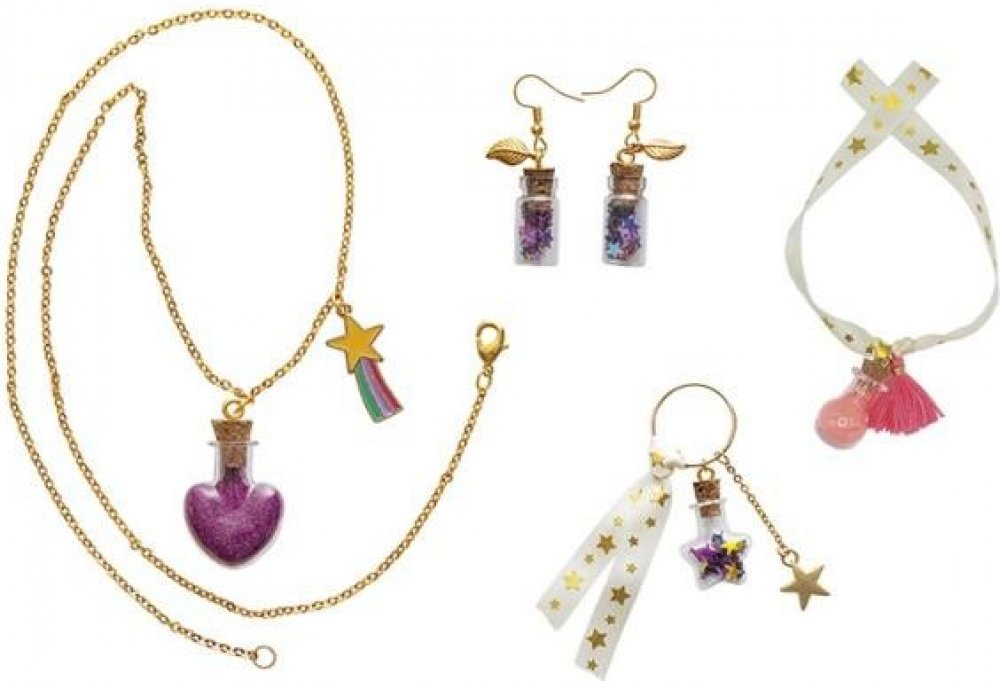 Tato kreativní sada vám umožní vytvořit 4 nádherné pohádkové šperky. Postupujte podle návodu k vytvoření šperku krok za krokem (1 náhrdelník, 1 pár náušnic, 1 náramek, 1 ozdoba na kabelku).