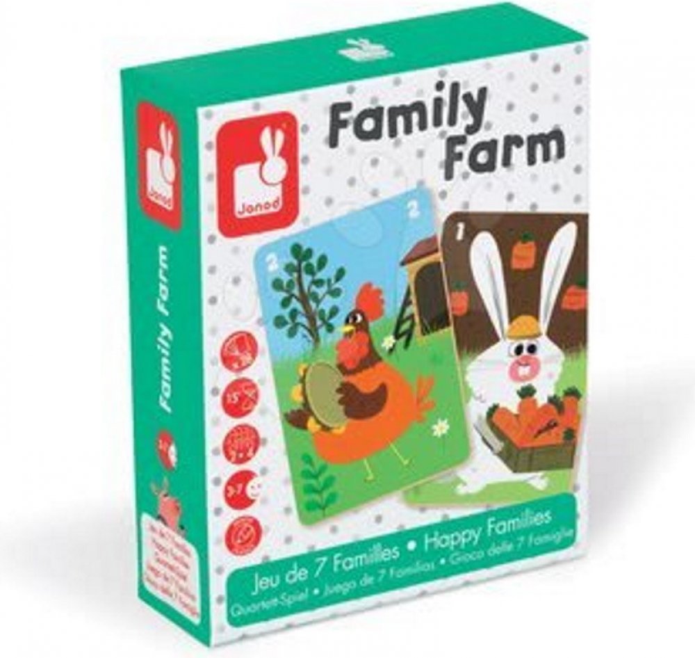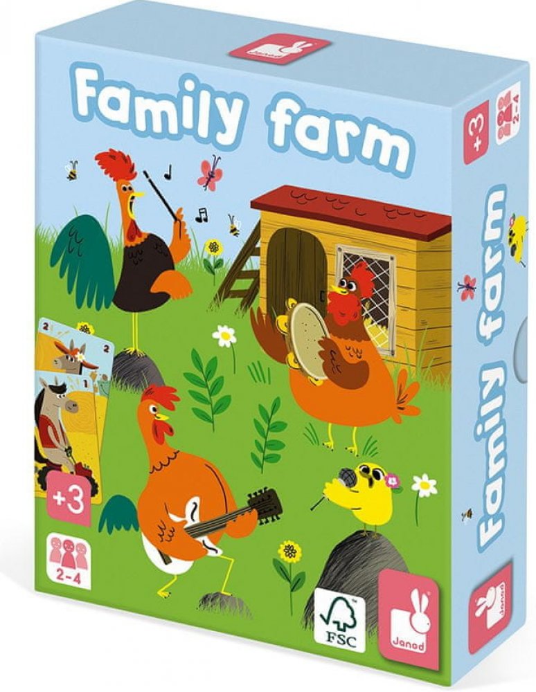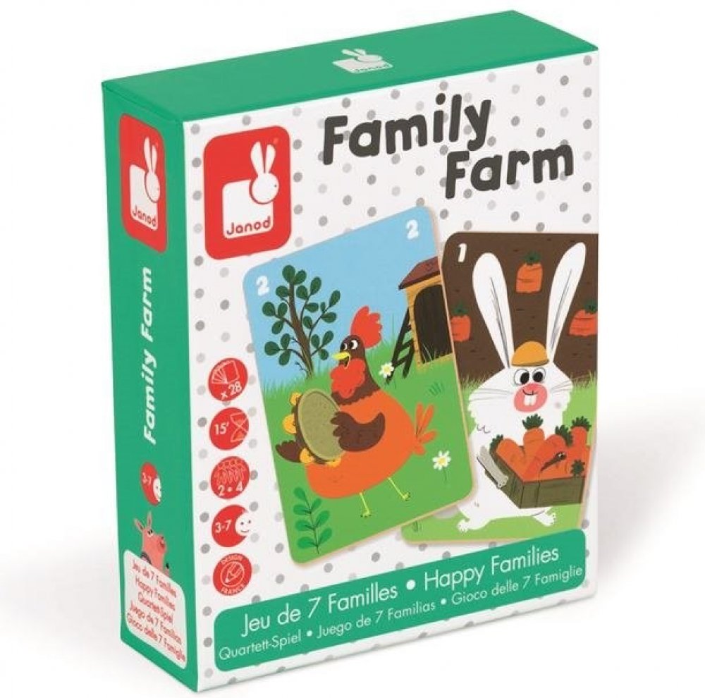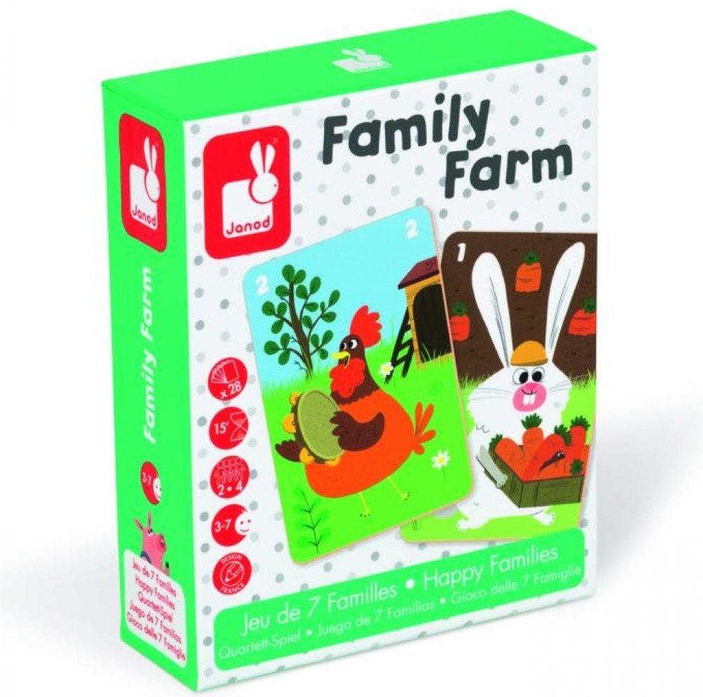 Cílem společenské hry Family Farm je posbírat co nejvíce zvířecích rodin. Krásné barevné ilustrace umožňují dětem poznávat život na farmě a učí se o různých druzích domácích zvířátek. Společenské hry jsou nejen zábavné, ale jsou zaměřeny i na optimální vývoj dítěte. Janod je francouzská společnost, která produkuje kvalitní hračky různých kategorií. Hračky Janod mají francouzský design a originální provedení.