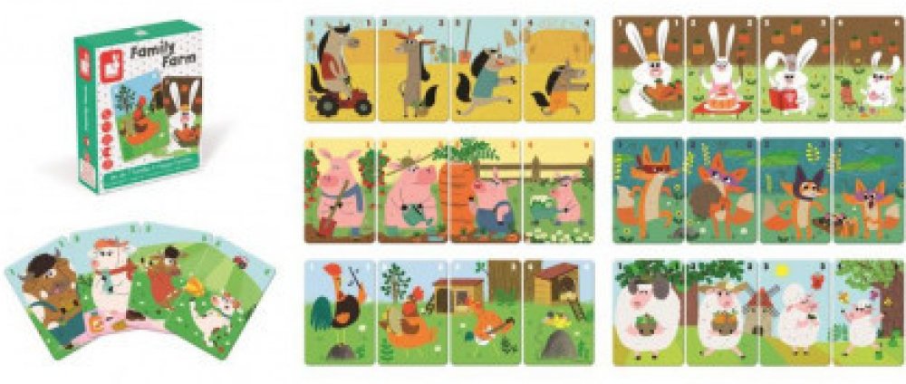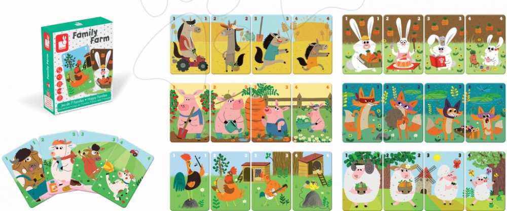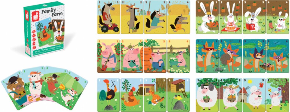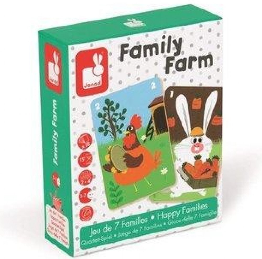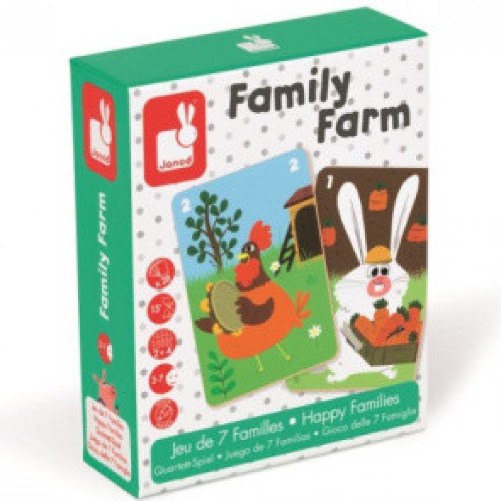 Cílem společenské hry Family Farm je posbírat co nejvíce zvířecích rodin. Krásné barevné ilustrace umožňují dětem poznávat život na farmě a učí se o různých druzích domácích zvířátek. Společenské hry jsou nejen zábavné, ale jsou zaměřeny i na optimální vývoj dítěte. Janod je francouzská společnost, která produkuje kvalitní hračky různých kategorií. Hračky Janod mají francouzský design a originální provedení.