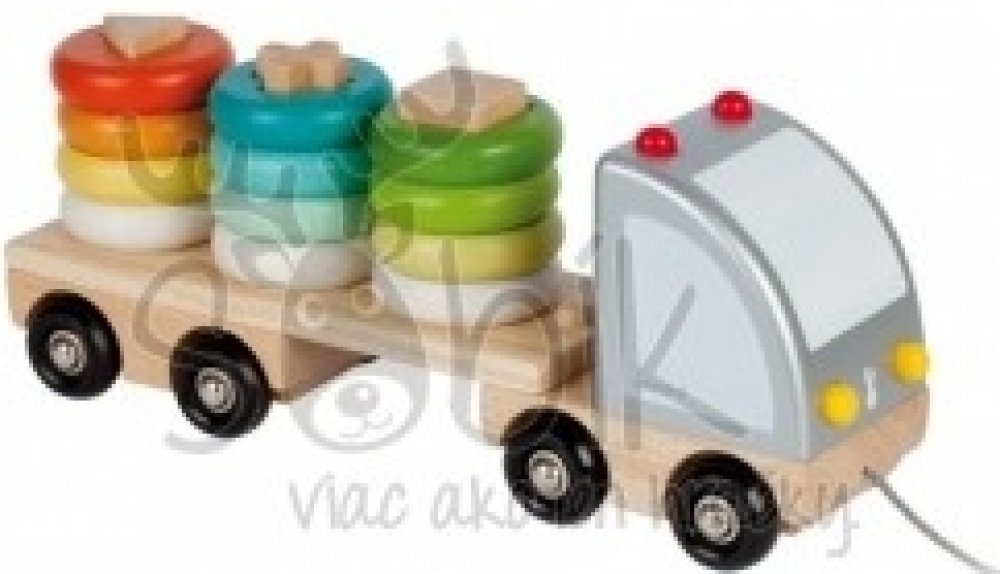 Krásny drevený kamión je nádherným darčekom pre všetkých malých kamionistov! Kamión je vkladacou a zároveň aj ťahacou hračkou. Obsahuje 3 stĺpiky rôzneho tvaru, na ktoré sa navliekajú drevené krúžky. Uložte drevené krúžky na správne miesto podľa tvaru otvoru a vytvorte ich skladaním rôzne farebné prechody! Je skvelou pomôckou na učenie sa farieb, tvarov a rozvoj jemnej motoriky.