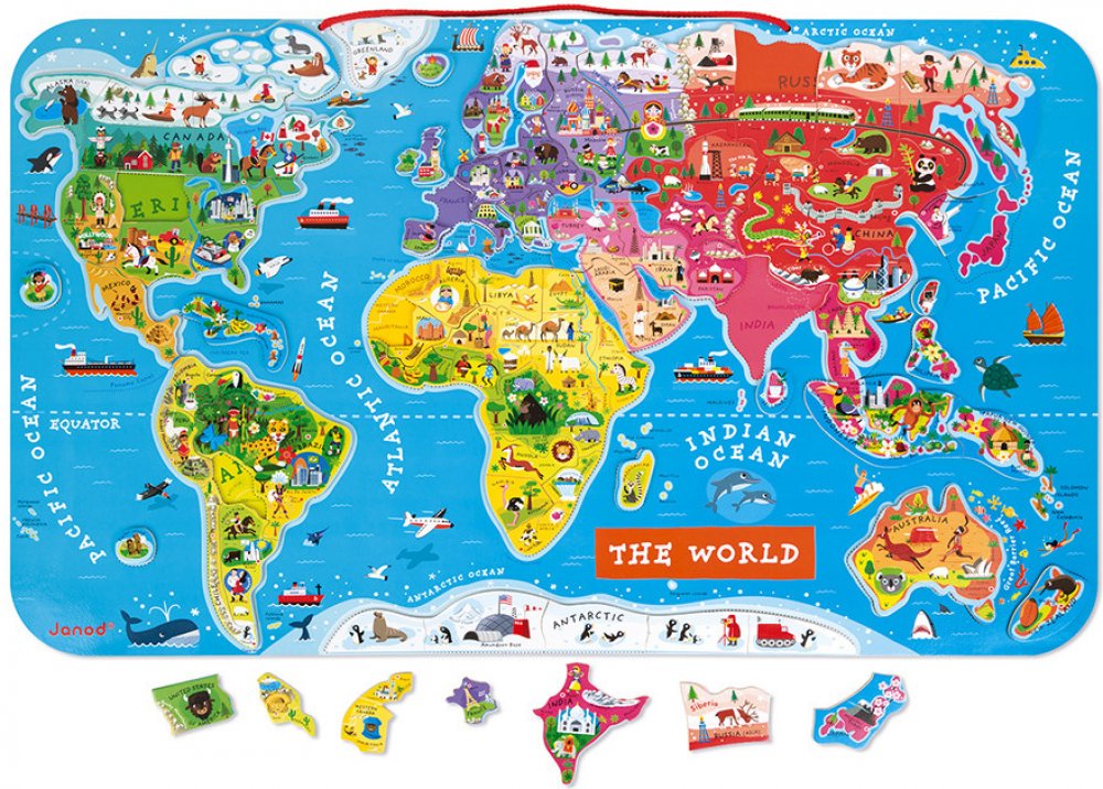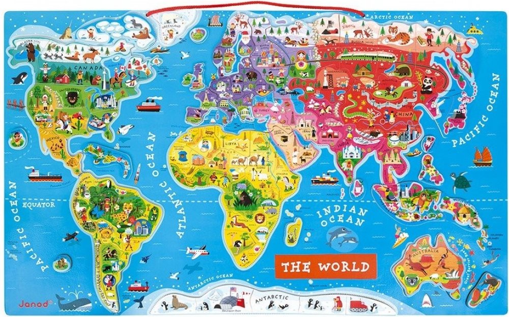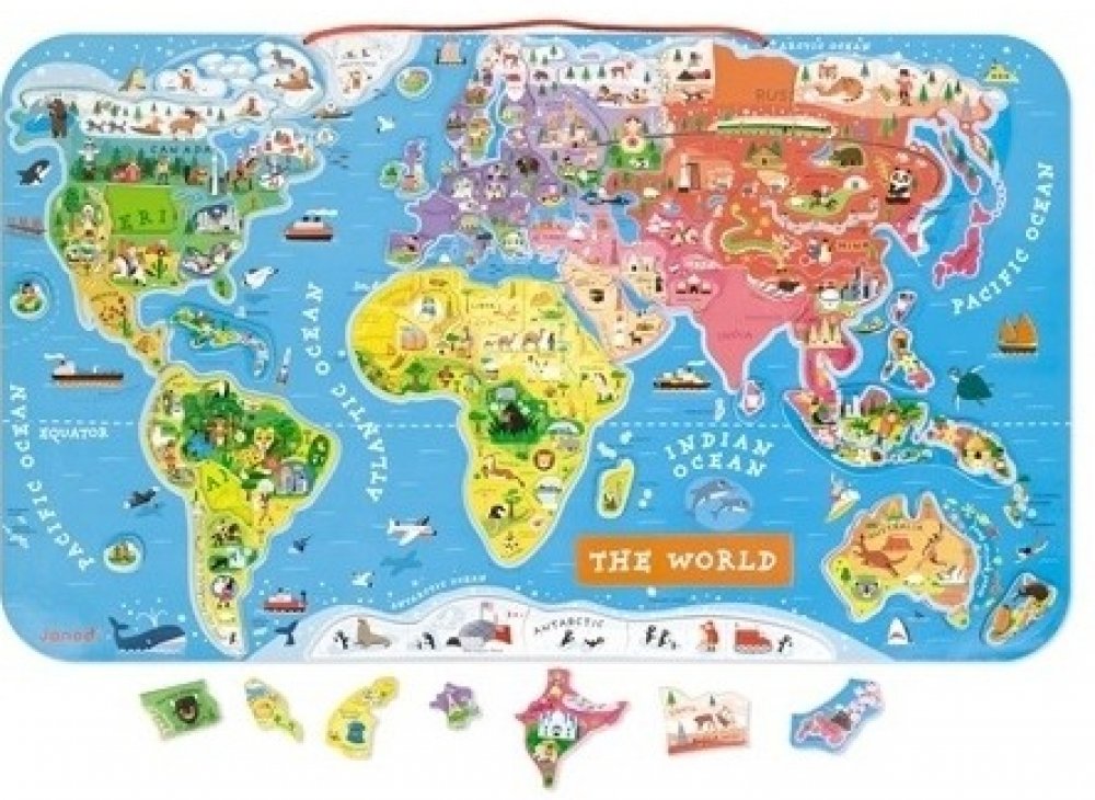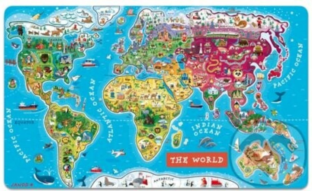 Zábava s magnety! Ví Vaše dítě, kde leží Madagaskar? Na kterém pólu žijí tučňáci? Odkud a kam vede Transsibiřská magistrála? Kde jste byli loni na dovolené? Chcete, aby Vašemu dítěti i další zeměpisné pojmy navždy vryly do paměti? Pořiďte mu velkou mapu světa se spoustou zajímavých detailů a naučte ho zeměpis hravou formou! Krásná magnetická mapa světa (rozměry 77 x 46 x 1 cm) obsahuje 92 dřevěných dílků puzzle, kde každý z nich reprezentuje region nebo zemi, nese název hlavního města a obsahuje obrázek charakterizující dané místo (významné stavby, památky, zvířata a rostliny z dané oblasti). Mapa je v anglickém jazyce . Mapu lze zavěsit na zeď, čímž se stává mimořádným doplňkem dětského pokoje. Vhodné pro děti od 5 let.
