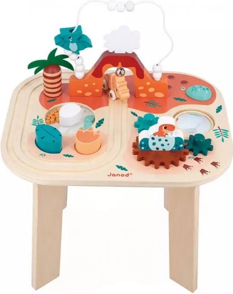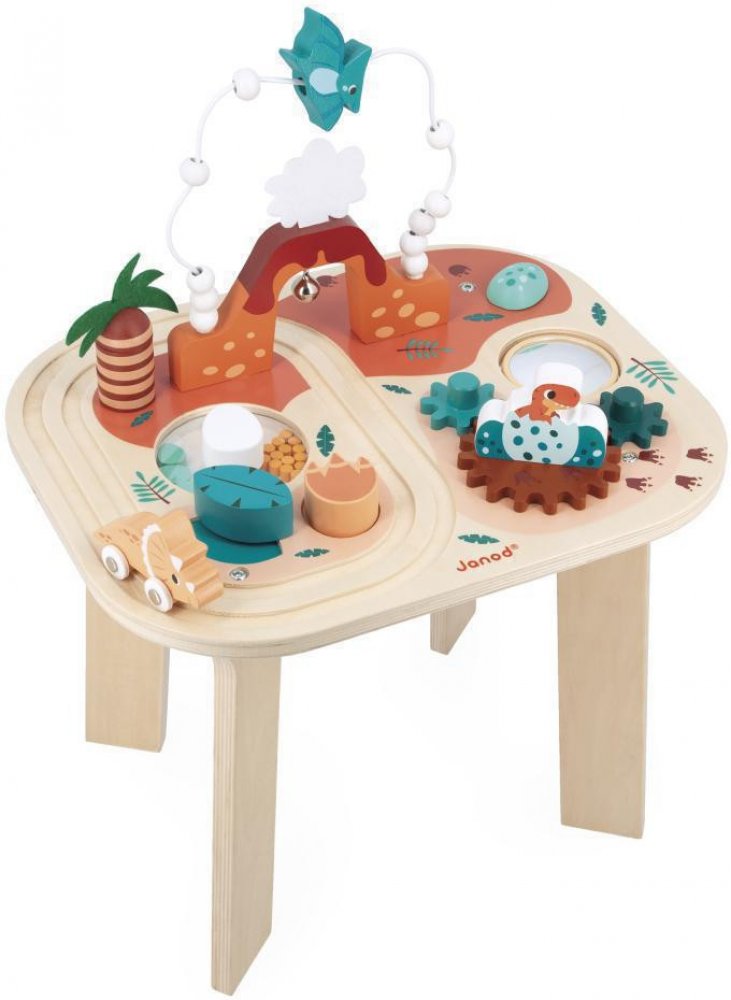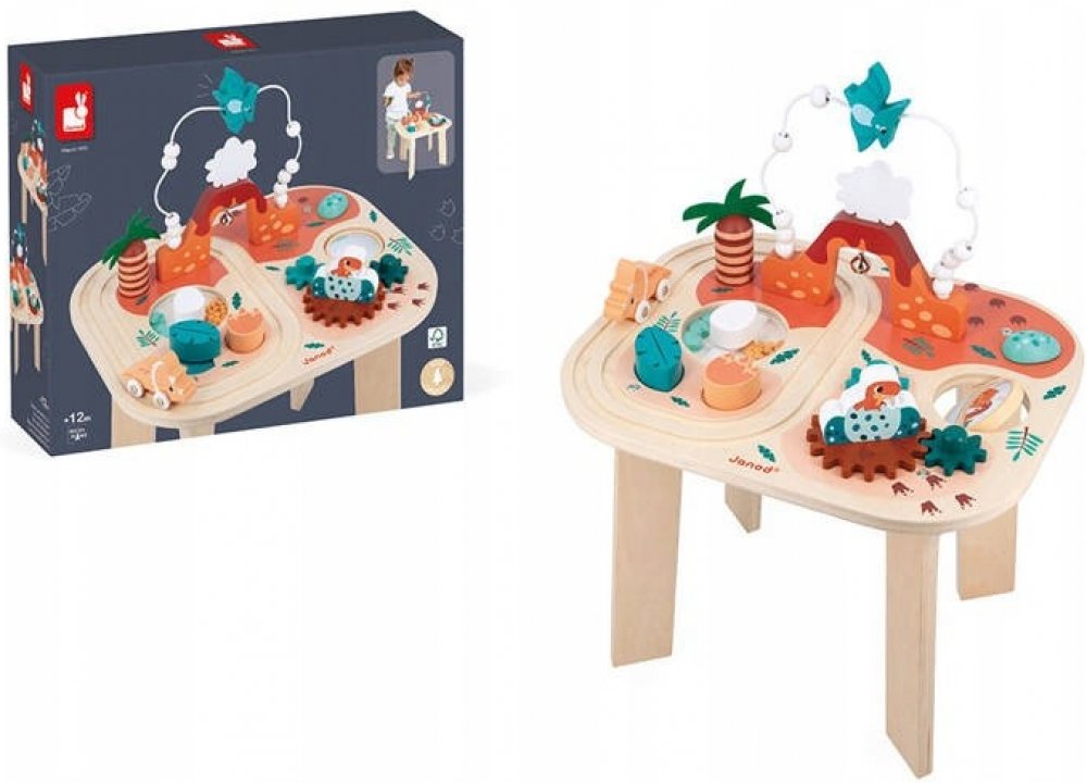 Vraťte se do doby dinosaurů a nechte vaše dítě ponořit se do živé atmosféry s tímto skvělým motorickým stolkem s aktivitami. Triceratops cestuje po svém okruhu, prochází pod sopkou a dotkne se zvonu, který začne „cinkat“. Pozor! Sopka vybuchne! Kouř rozeznáte hned díky plsti a počítadlu. Na druhém z nich létá malý Pteranodon z jednoho konce sopky na druhý, doprovázený 10 dřevěnými korálky. Hned vedle sopky se nachází palma, kterou je třeba skládat a znovu a znovu rozkládat. Na druhé straně stolu vychází z vajíčka mládě T-rexe, který se otáčí na svých třech ozubených kolečkách. Je něco skryto pod dopisem? A pod stopou? Hned máte 2 mohutné kusy k přemístění. Co se stane, když otočíte vajíčka? Hluk, zábava, všechno se točí a točí! Balení doplňuje otočné zkreslující zrcadlo zaručující smích. Celkově má stůl 8 aktivit na dlouhé hodiny hraní. Vaše dítě se bude moci bavit a zároveň rozvíjet svoji dovednost a představivost. Naučná hračka ze dřeva FSCTM. Výška podnosu je 32 cm, aby se k němu snáze dostaly i nejmenší.
