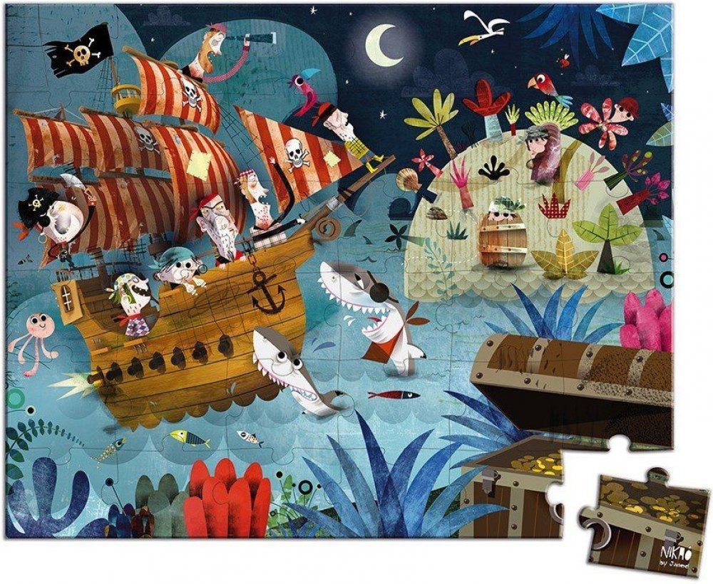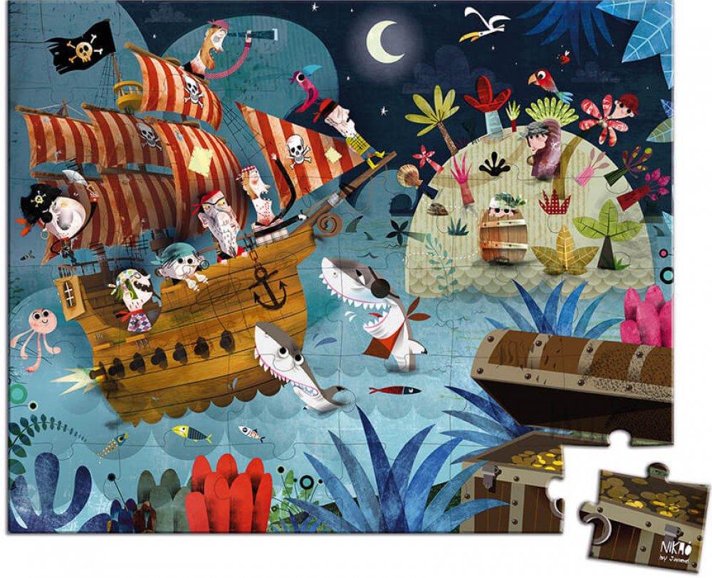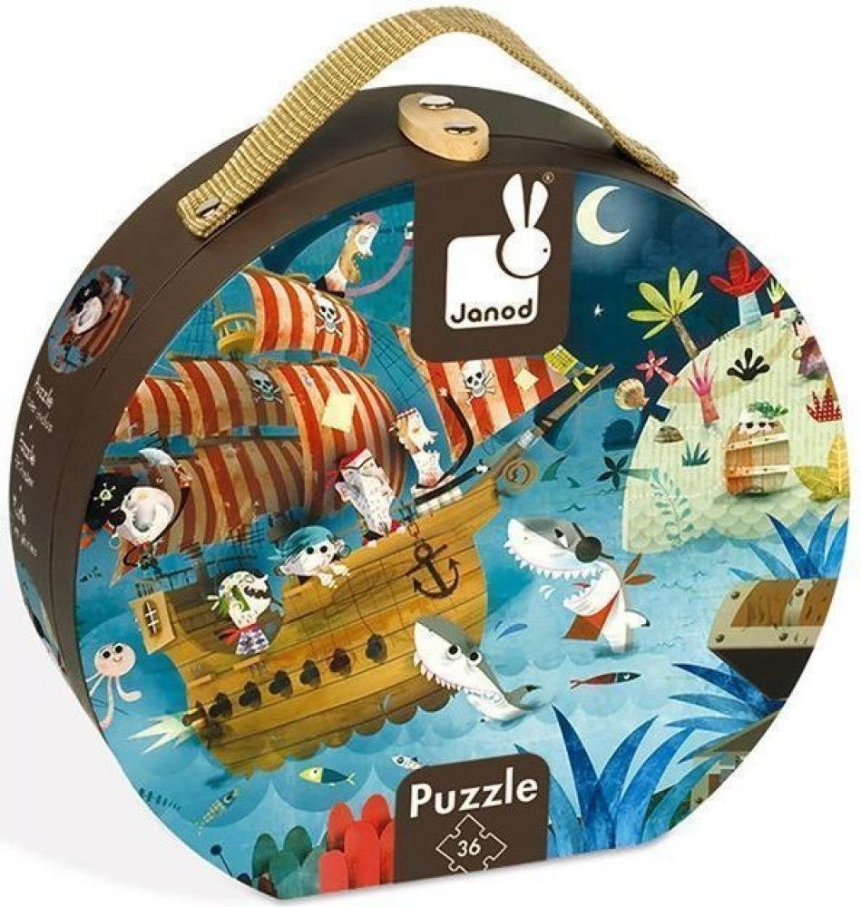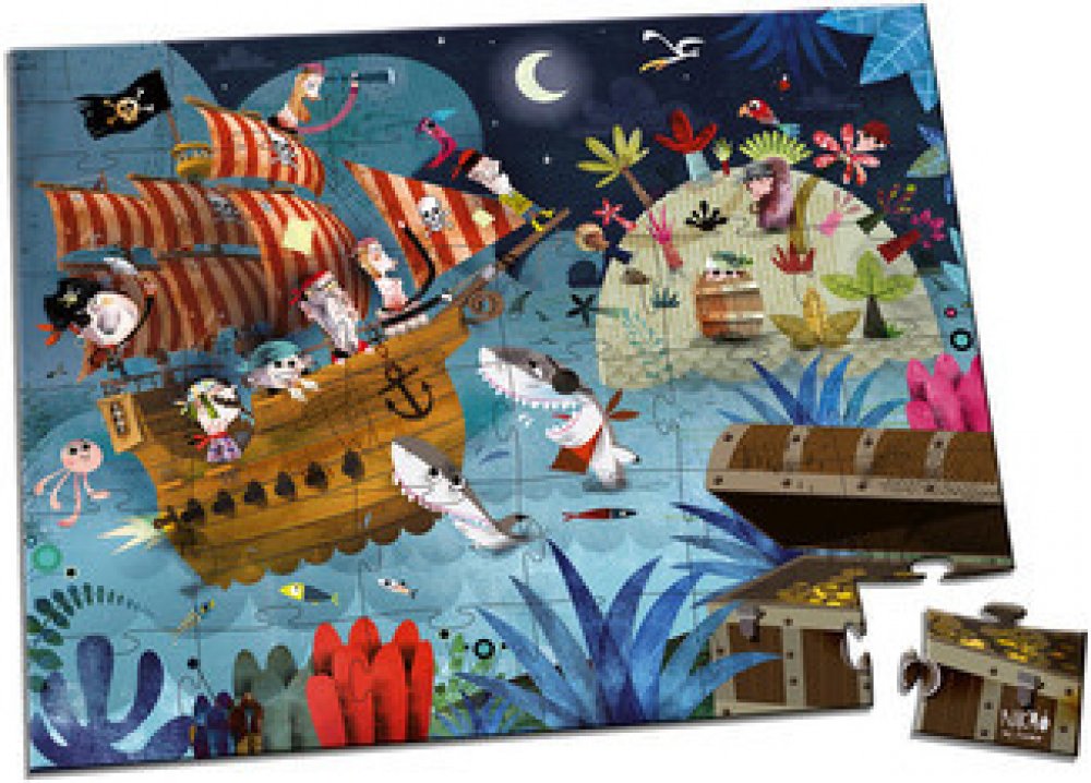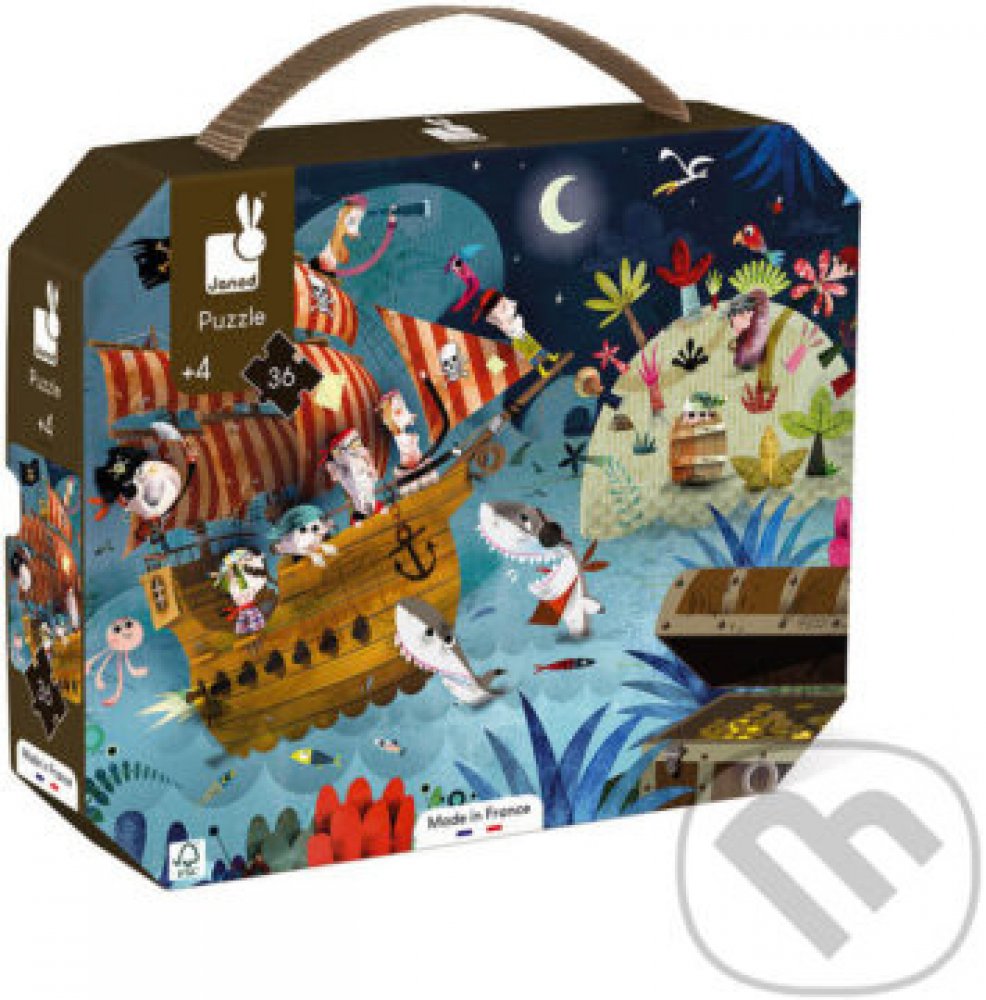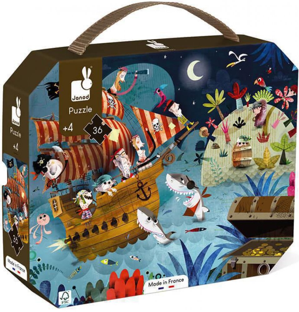 Pojďte s piráty hledat poklad. Tyto puzzle s nádhernými obrázky jsou v kufříkovém balení, které slouží na odkládání dílků, když si s nimi děti nehrají. Puzzle jsou vhodné pro děti od 4 let. Puzzle se skládají z 24 kusů trvanlivých a pevných kartonových dílků. Ukládají se rychle a snadno do krásného kufříku, díky kterému se jednoduše skladují a přenášejí.