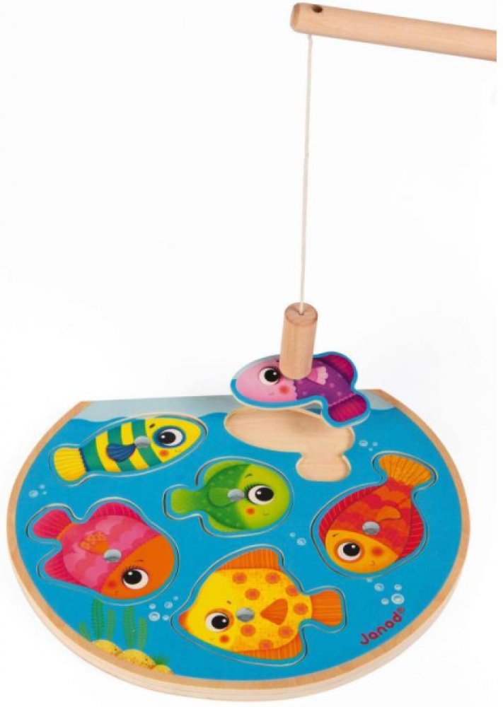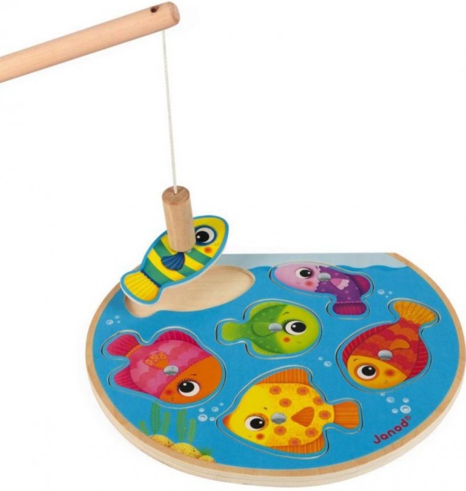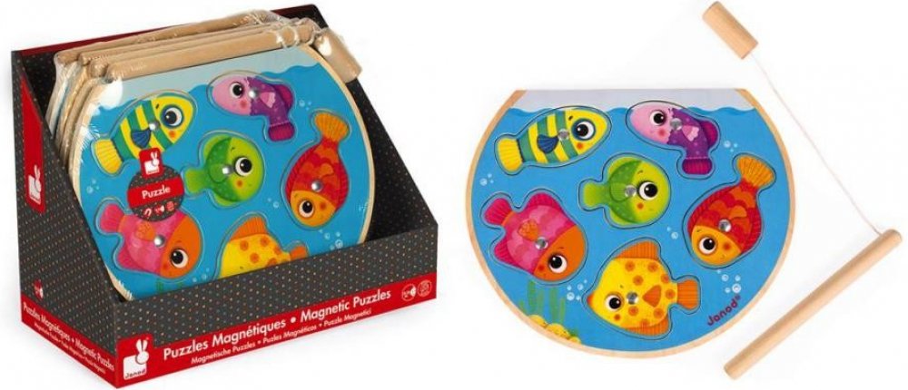 Dřevěné, pestrobarevné puzzle obsahuje celkem 6 ks ryb a 1 magnetický rybářský prut. Každá z ryb je opatřena kovovým nýtem a magnet rybářského prutu je zachycen v plastové části, aby se předešlo jeho odlepení.