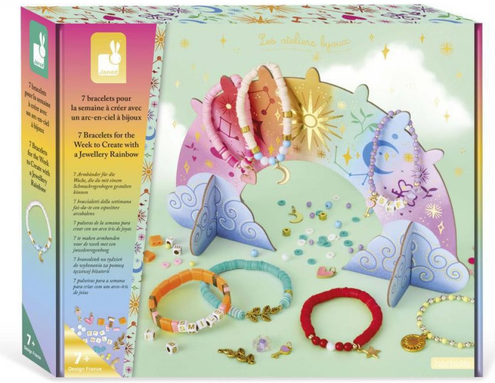 Ideální kreativní sada pro vyjádření vlastní osobnosti pro děti od 7 let – výroba 7 náramků!Tvorba šperků je skvělý způsob, jak rozvíjet kreativitu, jemnou motoriku a osobní styl. Náramek na každý den v týdnu!S touto sadou šperků si děti od 7 let mohou vyrobit 7 náramků a stojánek na jejich uložení. Každý den má svůj vlastní náramek, který je spojený s určitou barvou a energií. Stačí si ráno vybrat náramek podle energie, kterou právě potřebujete!Tato kreativní sada je skvělou aktivitou nejen pro rozvoj trpělivosti a šikovnosti, ale také nabízí možnost vyjádřit svůj styl skrze vlastní výtvory. Nošení ručně vyrobených šperků navíc posiluje sebevědomí a podporuje vyjadřování osobnosti.Obsah sady:- 6 kouzel (hvězda, měsíc, srdce, slunce, list, klíč)- 77 rokajlových korálků- 50 akrylových korálků- 4 korálky z měsíčního kamene- 22 kovových korálků- 470 korálků heishi- 22 čtvercových korálků- 8 písmenkových korálků- 1 květinový korálek- 8 rondelů- elastická nitSoučástí je i brožurka s návody a vzory, které děti krok za krokem provedou výrobou.Nejlepší část?Krásná duhová stojan na vystavení hotových náramků, připravených k nošení!Tento kreativní koníček je jednoduchý a bude velkým hitem u sedmiletých dětí, které začínají prosazovat svůj vkus a rády doplňují svůj outfit šperky s významem.Tak co – jakou energii dnes potřebujete?