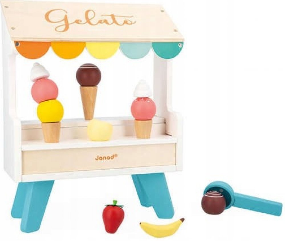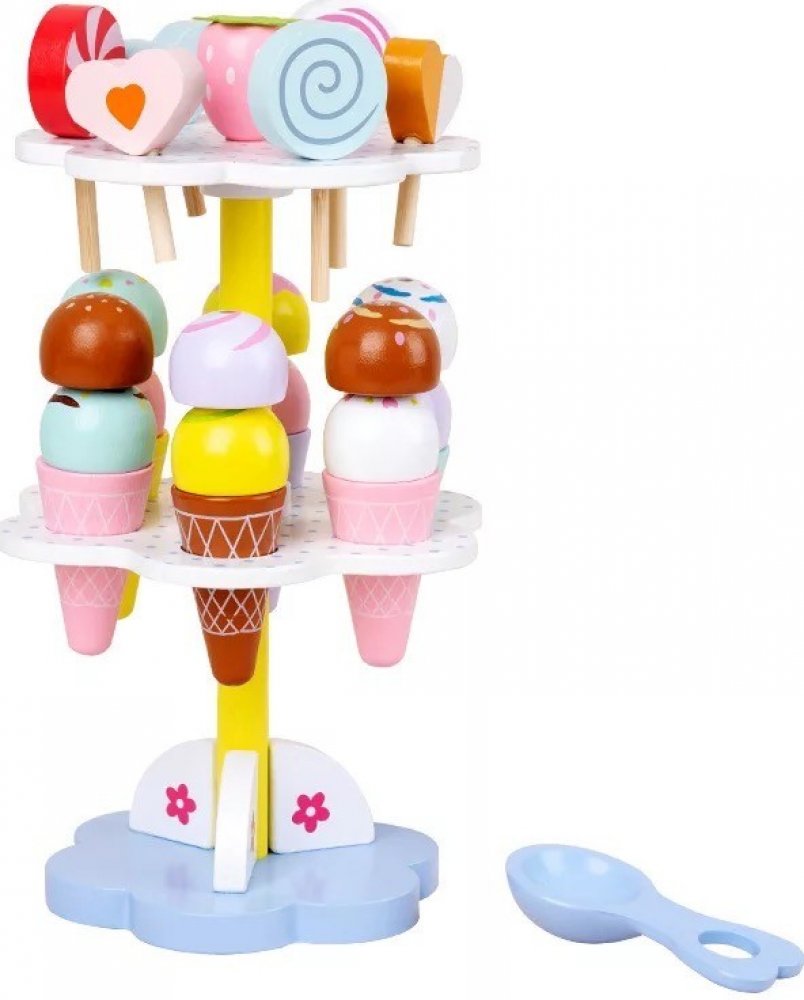 Vanilkovou, jahodovou nebo čokoládovou? Nechte se zlákat chutnou zmrzlinou... Pro každého tady máme něco! Tento skvělý stojan umožní vašemu dítěti připravit spoustu chutných zmrzlin. Skládá se ze 3 kornoutů, 6 kopečků znázorňujících různé příchutě, 2 druhů ovoce a krému Chantilly na ozdobu. Vše je magnetické včetně magnetické lžičky pro nabírání kopečků zmrzliny. Vaše dítě bude moci vytvářet krásné kompozice a vy budete chtít ochutnat a otestovat všechny chutě. Hračka rozvíjí představivost, interakci s ostatními a podporuje kreativitu. Hračka vyrobena ze dřeva FSCTM pro děti od 3 let.
