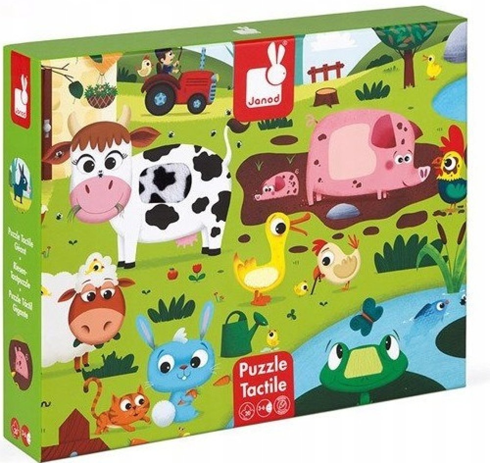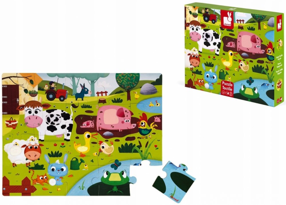 Rozvíjejí logické myšlení, paměť, představivost a jemnou motoriku rukou. Senzorické puzzle má 20 dílků a motiv zvířátek na farmě. Dílky zvířátek mají povrch tvořený speciální texturou, která je charakteristická i pro reálné zvířata.