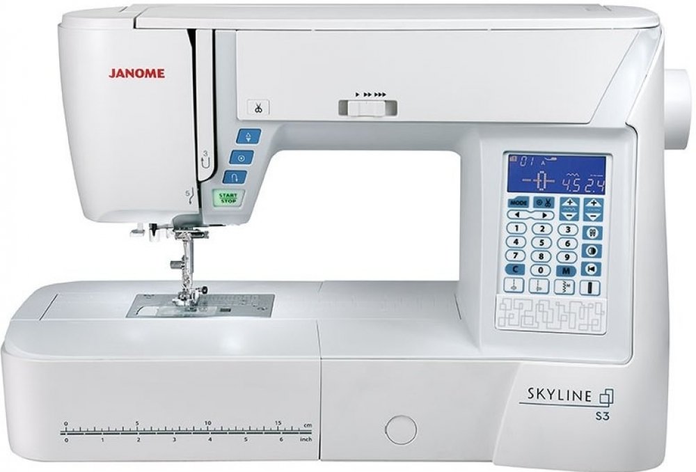 Janome Skyline S 3 je domácí elektronický šicí stroj s automatickým odstřihem a 120 druhy šicích stehů. Dále nabízí 7 druhů knoflíkových dírek a abecedu. Všechny knoflíkové dírky jsou jednokrokové. Přehledný LCD displej se zobrazením nastavení typu, šířky a délky stehu.