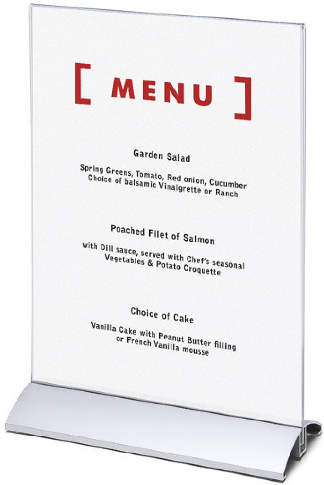 Menu stojánek na hliníkové základně ve formátu A4, který je orientovaný na výšku, je skvělým řešením pro prezentaci reklamních letáků či jiných tiskovin, a to nejen v kancelářském prostředí. Tento moderní nástroj je vyroben z kvalitního akrylátu, který zabraňuje jak vyblednutí, tak i poškození obsahu a kromě toho disponuje také stříbrnou hliníkovou základnou, která dodá nejen výbornou stabilitu, a...