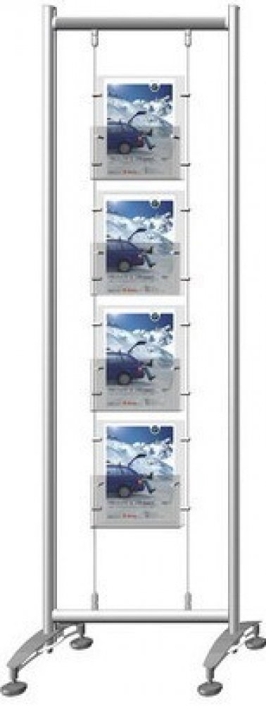 Sestava obsahuje: 1ks kompletní rám 2ks noha pro postavení rámu(vč. 2ks šroub M5x40) 2ks kit: ocelové lanko 1,5 + gripy pro uchycení do rámu 16ks boční grip jednostranný(do 4mm) 4ks akrylový zásobník A4Rám je dodáván jako stavebnice v krabici. Na vyžádání lze dodat včetně dopravy a montáže na místě.Na poptávku lze dodat rám v atypickém provedení.Formát 4x A4 (210x297 mm),Vnější rozměry 443x1930x42...