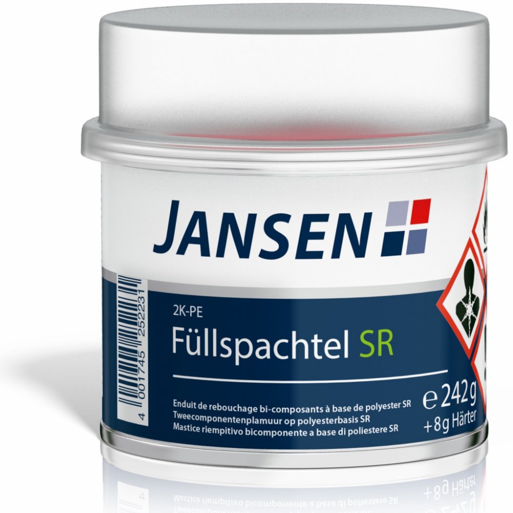 Dvousložkový výplňový tmel na karosářské a lakýrnické práce automobilů, dřevo, kov a tvrdé plasty, výrobu forem nebo lepení mramoru a umělého kamene na ocel, od německého výrobce Jansen. Tmel nepraská a neloupe se, má vysokou odolnost. Vytváří silnou vrstvu. Vynikající vydatnost, vyplňovací schopnost, brousitelnost a rychlá doba schnutí. Po vyschnutí lze nanášet jemný tmel pro docílení hladšího povrchu, přetírat různými druhy nátěrů nebo plničem. Tmel je vhodný pro použití ve venkovním i vnitřním prostředí.