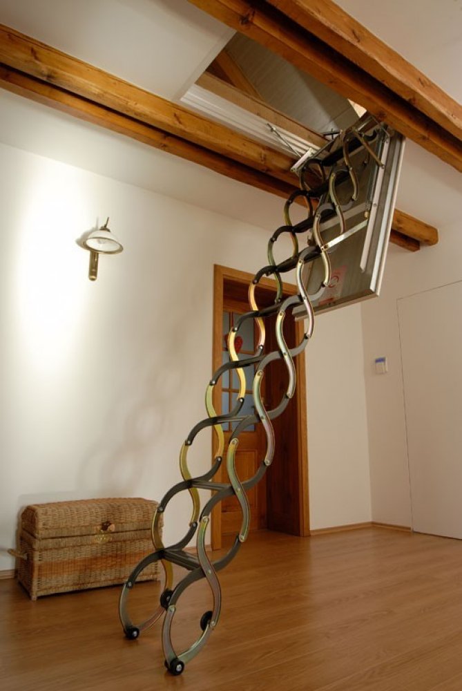 - konstrukce složené z rámu pro zabudování do stropu a kovového schodiště s pohyblivými díly, které se roztahují a stahují jako harmonika