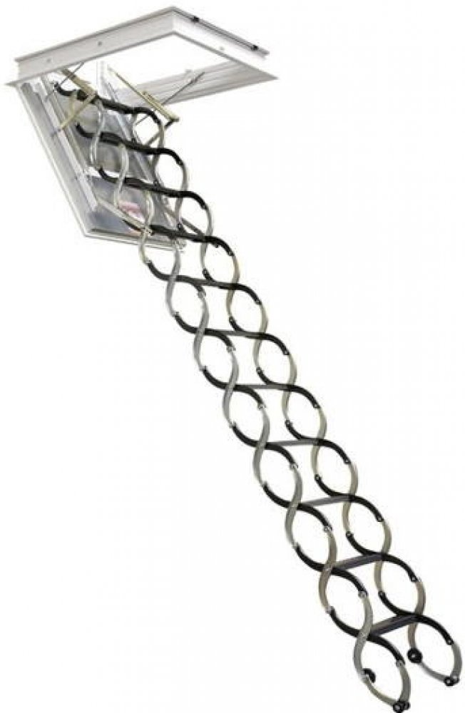 Schody s plechovým sendvičovým víkem pro zabudování do stropu. Uvnitř víka je tepelná izolace. Otevírací systém víka je od rozměru d ≥ 1000 mm opatřen brzdícím mechanismem proti prudkému otevření.