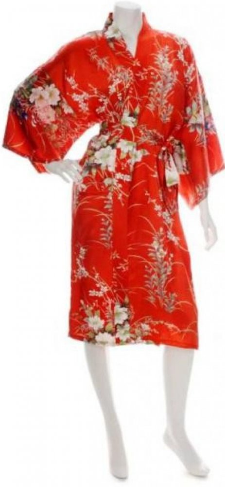 Elegantní dámské kimono je vyrobeno ze 100% hedvábí. Díky tomuto hebkému materiálu je neuvěřitelně příjemné na dotek. Kimono v červéné barvě je zdobeno bílými květy a bylo navrhnuto i vyrobeno v japonském městě Kjóto. Délka kimona je 107 cm a je vhodné pro EU velikost 36 až 42.