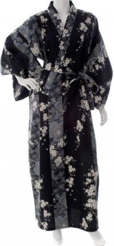 barva: černá se vzorem třešňových květůpůvod: Japonskosoučástí: 4 cm široký pásekDámský župan - jukata s bílými třešňovými květy na černém pozadí