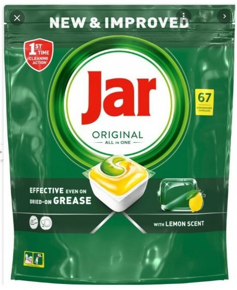Jar tablety do myčky 67 ks Original Lemon jsou klasické jarové kapsle na nádobí s vysokou účinností a citrusovou vůní s novým složením. Aktivní složky jsou odděleny ve třech separátních komorách, díky čemuž dojde k jejich uvolnění postupně, právě ve správný okamžik, a tak je docíleno optimálního mycího účinku. Tablety do myčky odmašťují, rozkládají i odolné a připečené zbytky jídla, pomáhají odstr...