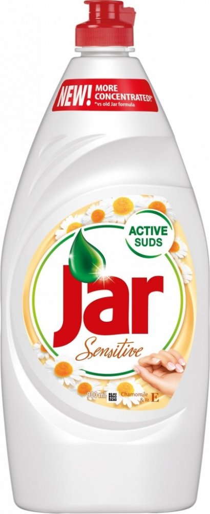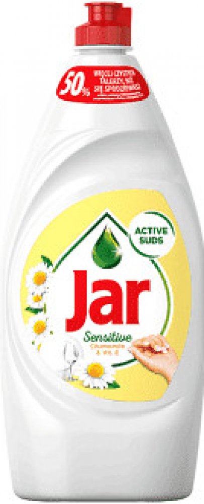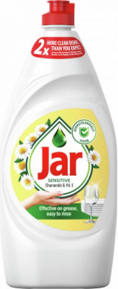 Jar na nádobí Sensitive heřmánek, 900 ml Jar je koncentrovaný prostředek na ruční mytí nádobí. Díky účinnému složení stačí malé množství přípravku na velké množství nádobí. Má dlouhotrvající aktivní pěnu. Snadno si poradí se znečištěným a mastnotou. Má příjemnou vůni a je šetrný k rukám.