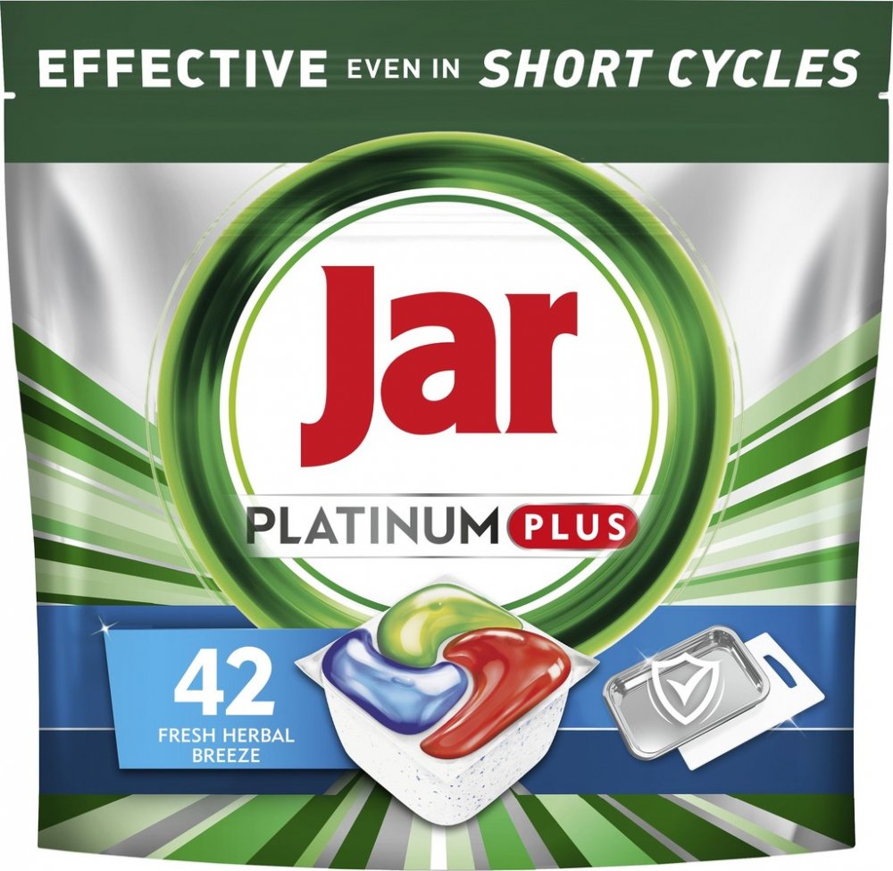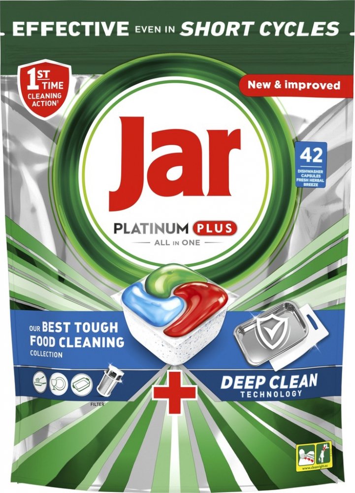 Tablety do automatické myčky nádobí Jar Platinum Plus All in One zanechávají nádobí čisté jako nové a mají nejlepší čisticí účinky z kolekce Jar na odolné zbytky jídla. Jar Platinum Plus poskytuje vynikající čistotu a odstraňuje odolné skvrny od jídla i v podmínkách krátkého cyklu. Pokud tedy máte málo času, nic se neděje. Přepněte na krátký režim. Jar v sobě slučuje tekutý i práškový čisticí pros...