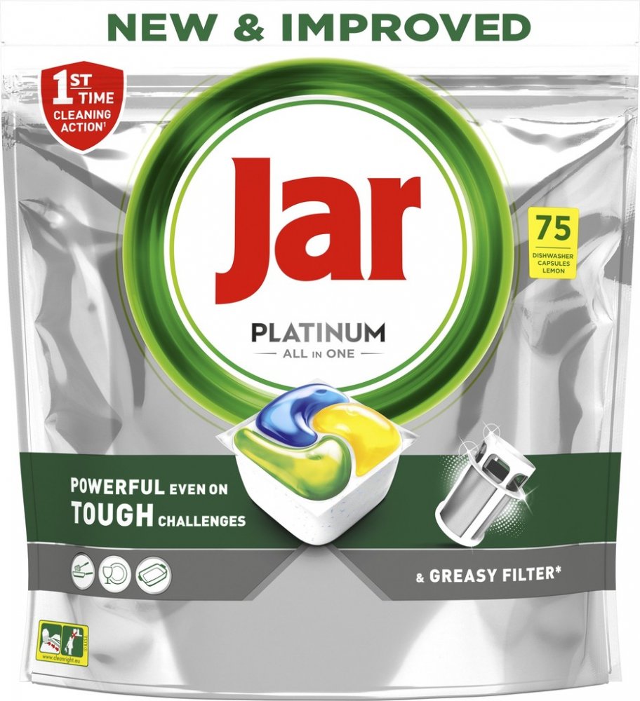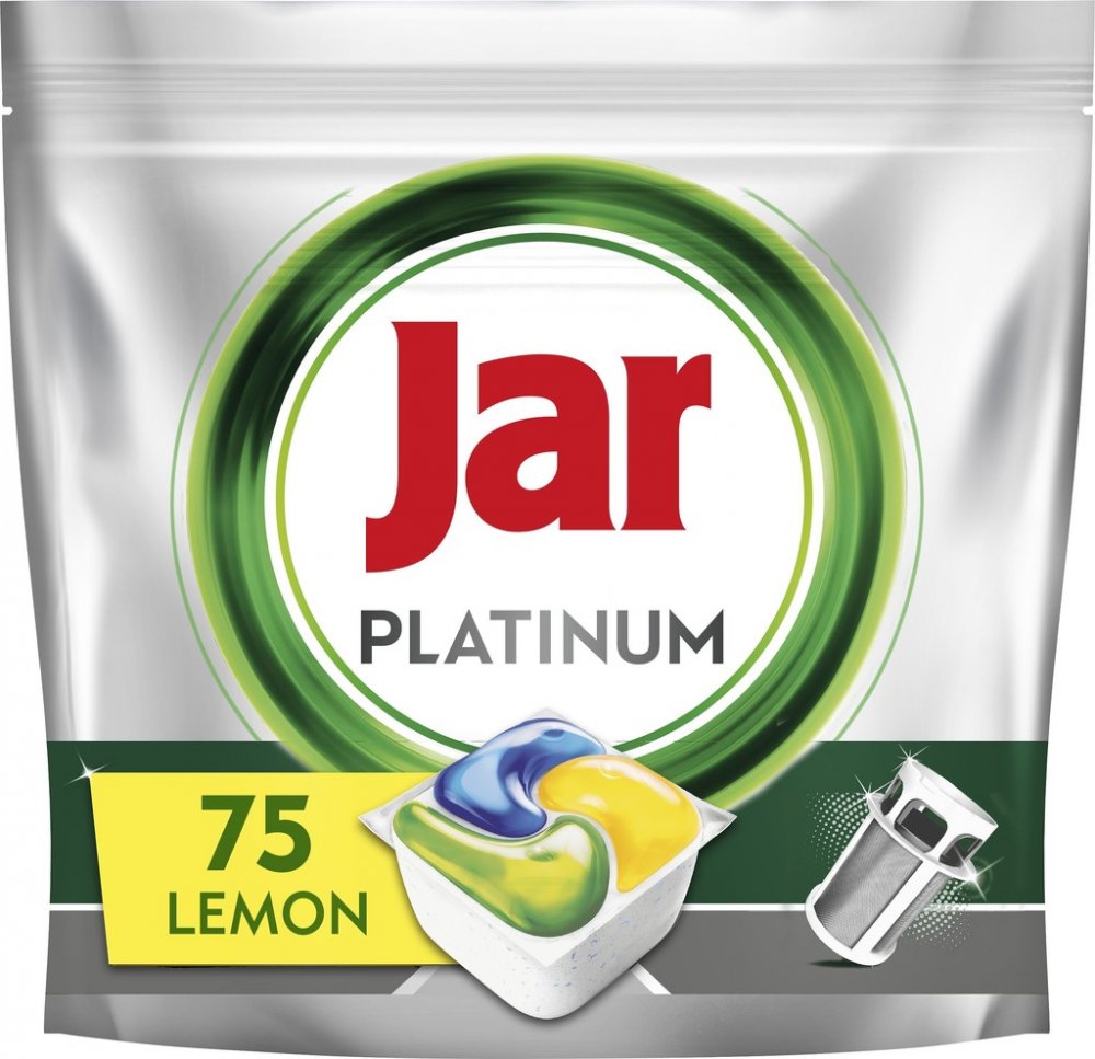 Jar tablety do myčky Platinum All In One Lemon působí již při prvním použití. Účinné složení odstraní i tu nejodolnější špínu a vaše nádobí zanechá dokonale čisté. Kapsle Jar Platinum jsou tak účinné, že můžete vařit, cokoli chcete a vaše nádobí bude stejně zářit čistotou. Zanechají čistý i mastný filtr v myčce. Jar Platinum kapsle do myčky All in One Lemon se rozpouští daleko rychleji než pevné tablety a jejich účinek nastupuje okamžitě. Jejich použití je velice snadné, stačí je vložit do myčky. Kapsle se nerozbalují, takže nevzniká žádný odpad. poradí si i s odolnými nečistotami hned při 1. umývaní pomáhají předcházet usazování mastnoty v myčce udržují vaši myčku nádobí čistou a voňavou 75 kusů