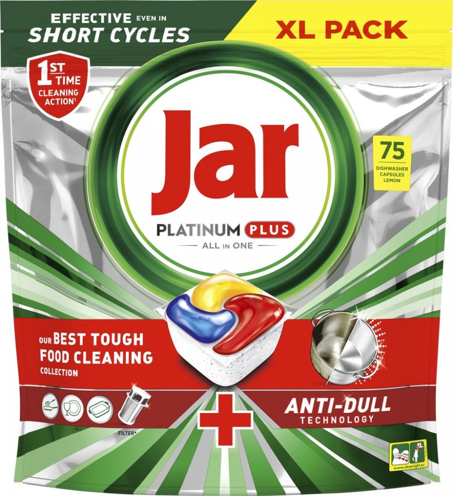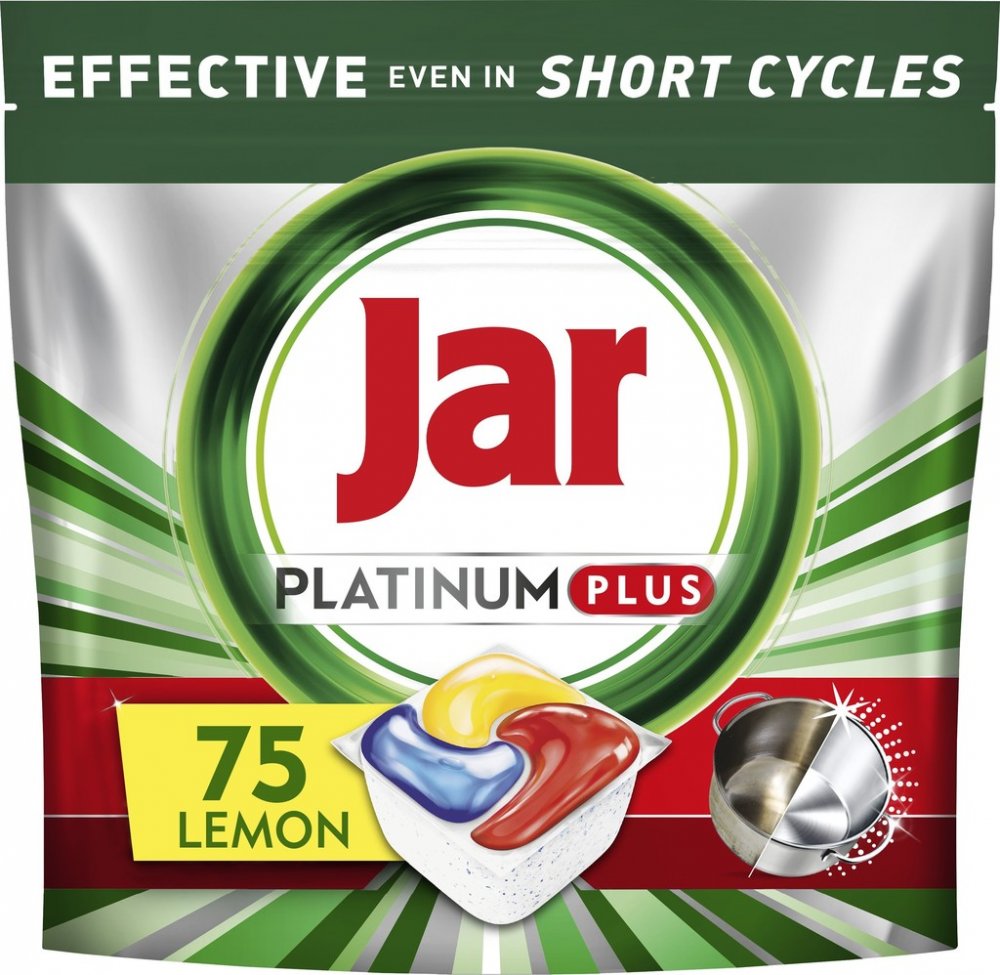 Jar Platinum Plus tablety do myčky jsou vlajkovou lodí značky Jar. Účinné složky jsou odděleny ve třech separátních komorách, díky čemuž dojde k jejich uvolnění právě ve správný okamžik. Tableta tak docílí optimální účinnosti. Tablety do myčky odmašťují, rozkládají i odolné a solně připečené zbytky jídla, pomáhají odstraňovat zašedlost a obnovují původní lesk nádobí, pečují o sklo, čistí filtr myčky a mycí ramena.