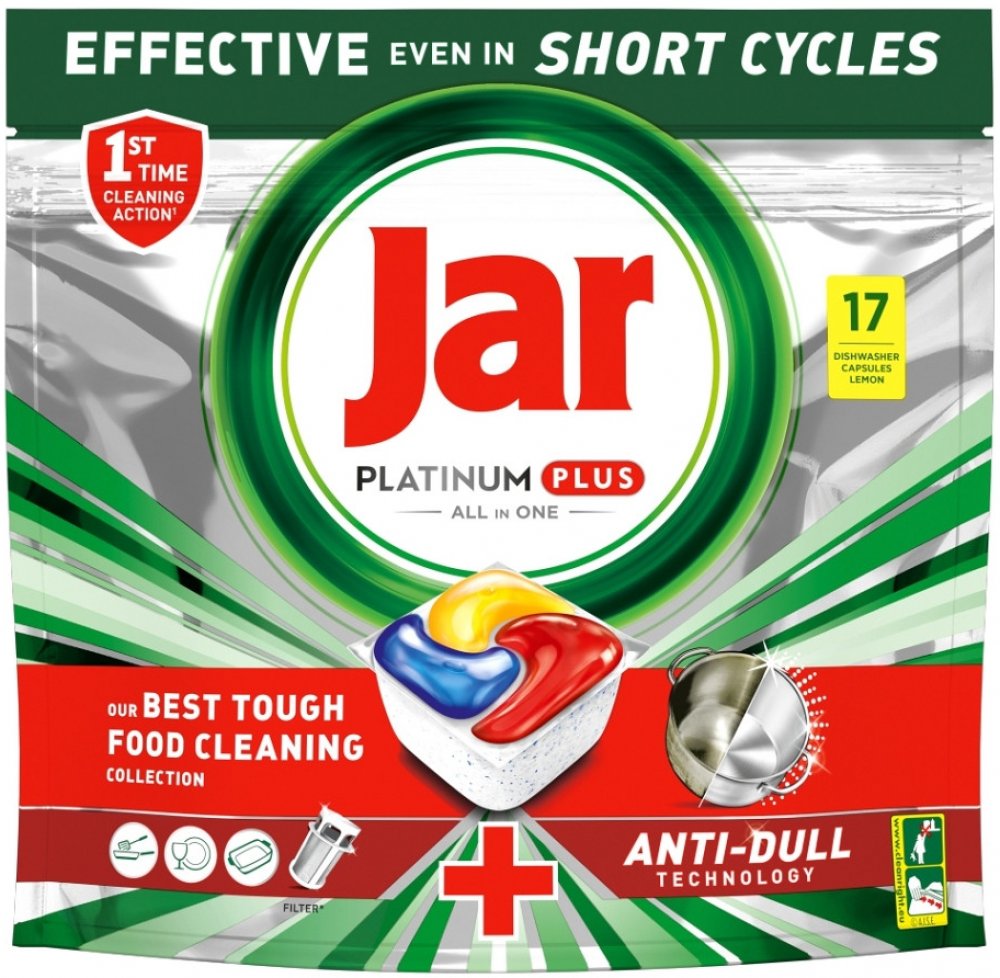 Popis výrobku: s vůní citronu účinný dokonce v krátkých cyklech obsahují sůl a prostředek na oplachování pro dlouhotrvající čistotu odstraňují zasedlý povlak a navrací nádobí původní lesk Jar kapsle do myčky Platinum Plus All in One Lemon zanechávají nádobí čisté jako nové a mají nejlepší čisticí účinky. Dokonce pomáhají odstraňovat zašedlost vznikající časem a obnovují původní lesk nádobí. Jar kapsle do myčky Platinum Plus poskytují vynikající čistotu a odstraňují odolné skvrny od jídla i v podmínkách krátkého cyklu. Pokud tedy máte málo času, nic se neděje. Přepněte na krátký režim. Jar v sobě slučuje tekutý i práškový čisticí prostředek v jedné účinné kapsli. Vysoce rozpustný obal se rychle rozpouští a funguje dobře i při krátkých cyklech, protože nádobí se začíná ihned umývat. A navíc se kapsle tak snadno používají! Přepněte na krátký cyklus a ušetřete oproti běžnému standardnímu cyklu čas, energii a vodu díky kapslím do myčky od značky Jar.