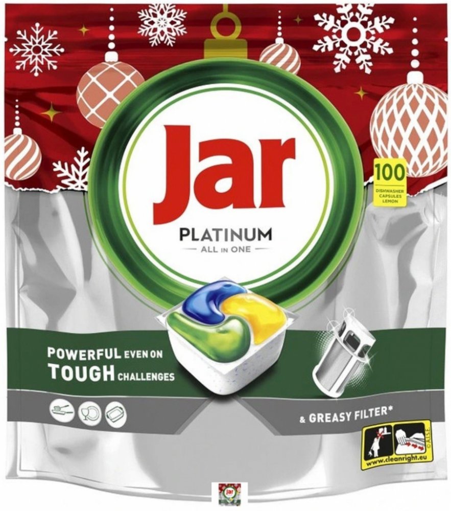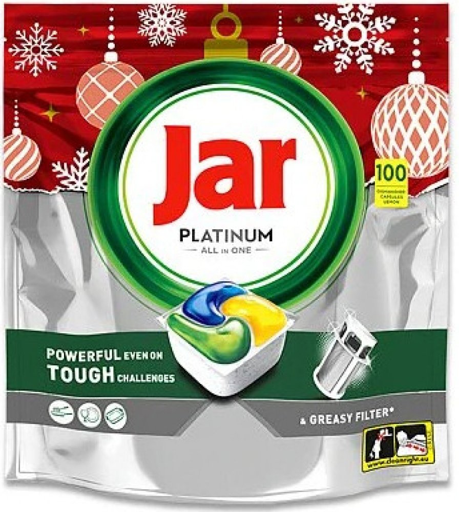 Kapsle do myčky Jar Platinum Vše v jednom jsou účinné hned při 1. umývaní a dokážou si poradit i s těmi nejodolnějšími nečistotami, aby vaše nádobí zářilo čistotou. Kapsle Jar Platinum mají čisticí sílu, díky které se nemusíte bát cokoliv uvařit. Můžete si být jistí, že vám pomohou vyčistit i mastný filtr myčky, aby vaše nádobí zářilo čistotou a myčka svěže voněla. Jar spojuje v jedné účinné kapsli tekutý i práškový prostředek na mytí nádobí. Vysoce rozpustný obal se rychle rozpouští, takže nádobí se začíná ihned umývat. A navíc se kapsle tak snadno používají.