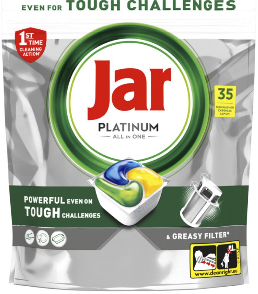 Jar tablety do myčky 35 ks Platinum Lemon All-in-One mají vysoký čisticí účinky hned při 1. umývání, a proto není potřeba nádobí předmývat. Díky svému složení umyjí i zaschlou mastnotu. Jar kombinuje v jedné účinné kapsli tekuté a práškové složky. Kapsle jsou velmi snadno rozpustné. Rozpouští se daleko rychleji než pevné tablety, takže začínají fungovat ok...