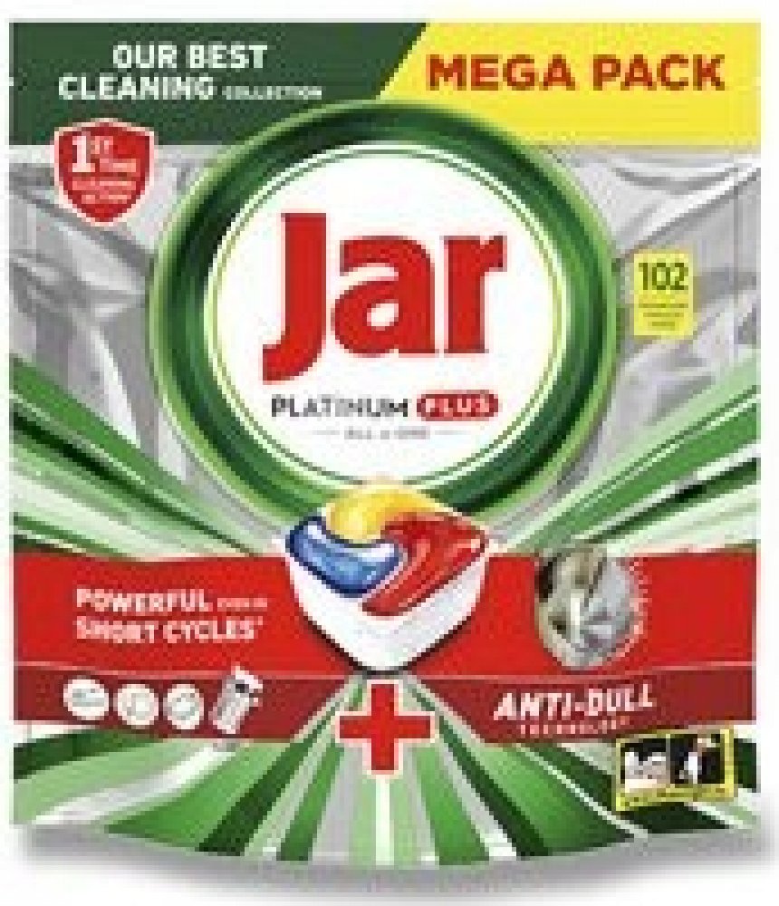 Tablety Jar Platinum Plus All In One do automatické myčky nádobí zanechávají nádobí čisté jako nové a mají nejlepší čisticí účinky Jaru na odolné zbytky jídla. Pomáhají dokonce odstraňovat zašedlost vznikající časem a obnovují původní lesk nádobí. Jar Platinum Plus poskytuje vynikající čistotu a odstraňuje odolné skvrny od jídla i v podmínkách krátkého cyklu. Pokud tedy máte málo času, nic se nedě...