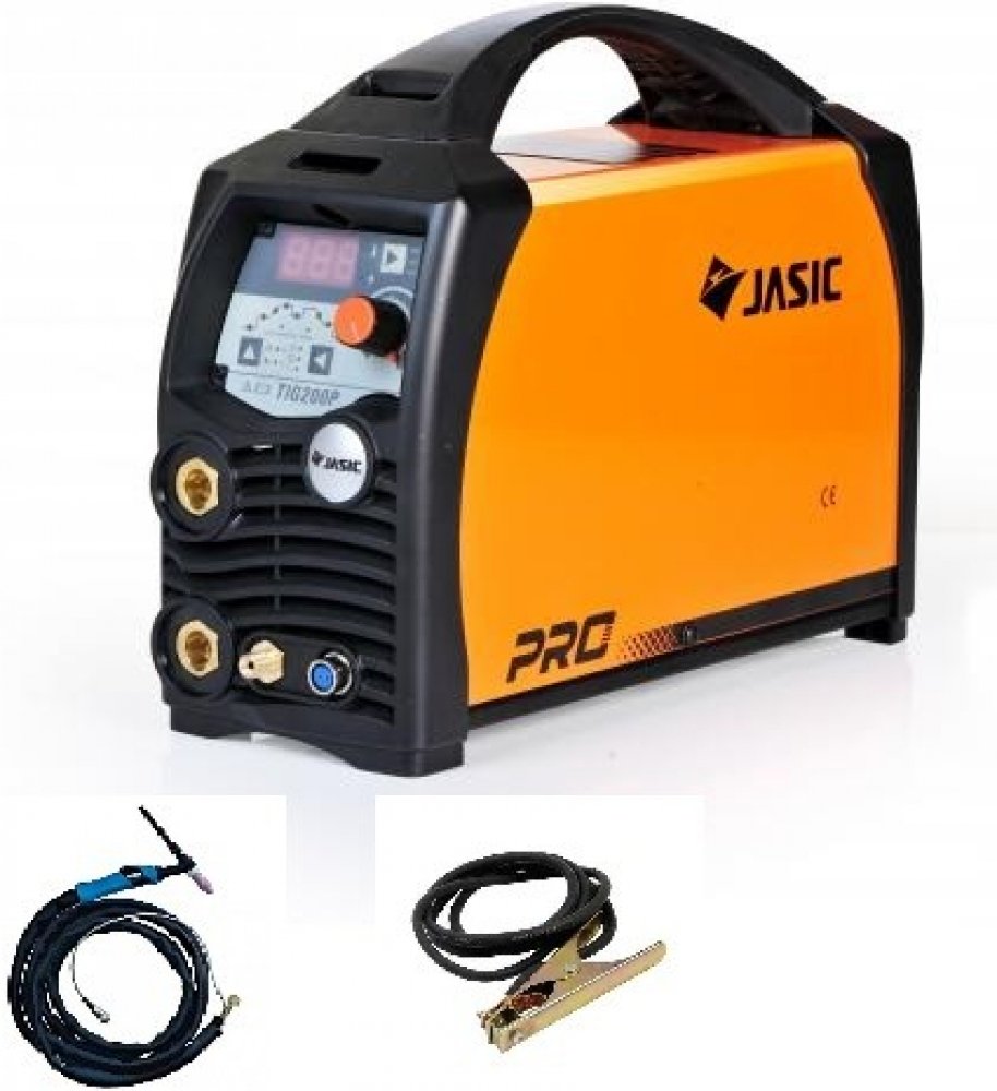 Svářečku Jasic TIG 200P HF, hořák SR 26 s rychlospojkami 35-50 - délka 4 metry, zemnící kabel 16 mm - délka 3 metry, osazení hořáku - keramická hubice velikosti 4 + 5 + 6 + 7, domeček kleštiny 3,2 mm, kleština 1,6 + 2,4 + 3,2 mm, kryt elektrody dlouhý + krátký + wolframová elektroda šedá WC20 1,6 mm.