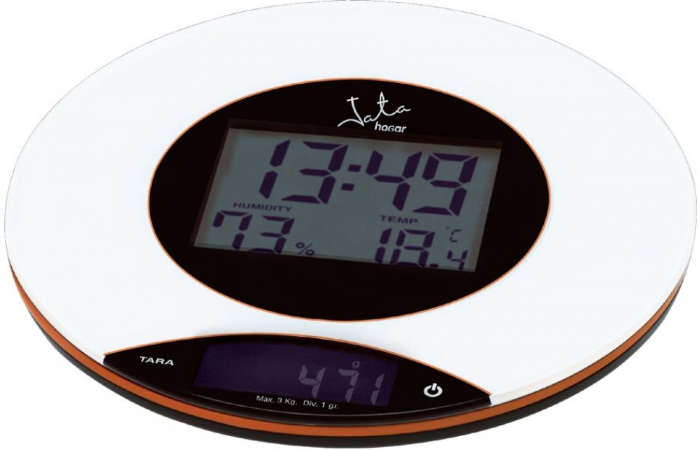 Elektronická kuchyňská váha Jata 756, snadno čitelný podsvícený LCD displej: datum,čas, časovač, teplota, vlhkost, dotyková tlčítka, vysoká přesnost, možnost zavěsit na zeď, automatické vypnutí, indikátor baterie, indikátor přetížení, napájena AAA 1,5V (není součást balení) .