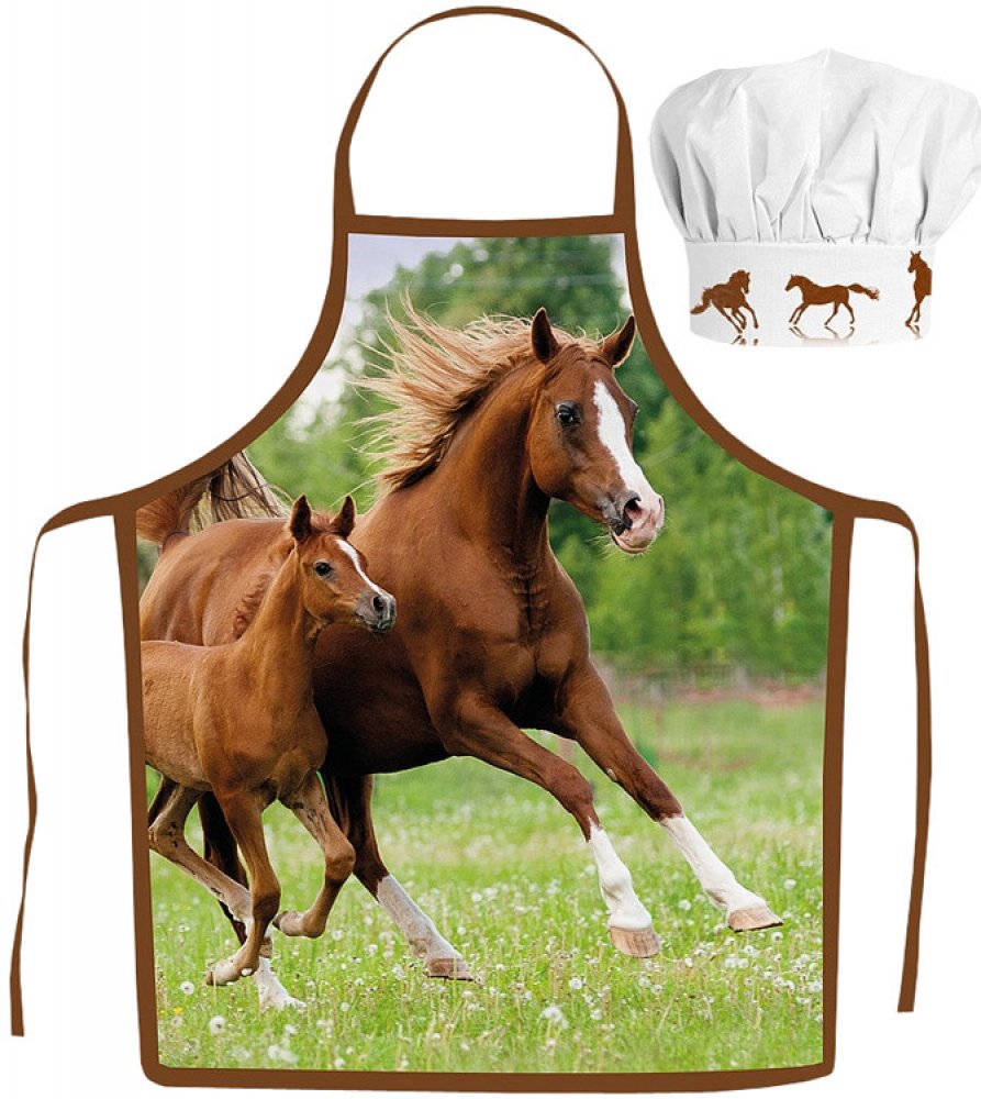 Krásná barevná zástěra se zvířecím motivem, na které jsou zobrazeny koně cválající po louce, je vhodná pro kluky i holky. Pokud chcete doma zapojit své děti do vaření nebo pečení, pořiďte zástěru i jim, určitě jim tím uděláte velkou radost. Velikost čepice lze regulovat pomocí suchého zipu. Zástěra je vyrobena z polyesteru a splňuje všechny evropské normy.